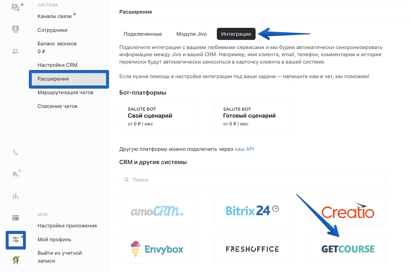 Для подключения зайдите в приложение Jivo > "Управление" > "Расширения" > "Интеграции" и нажмите на GetCourse.