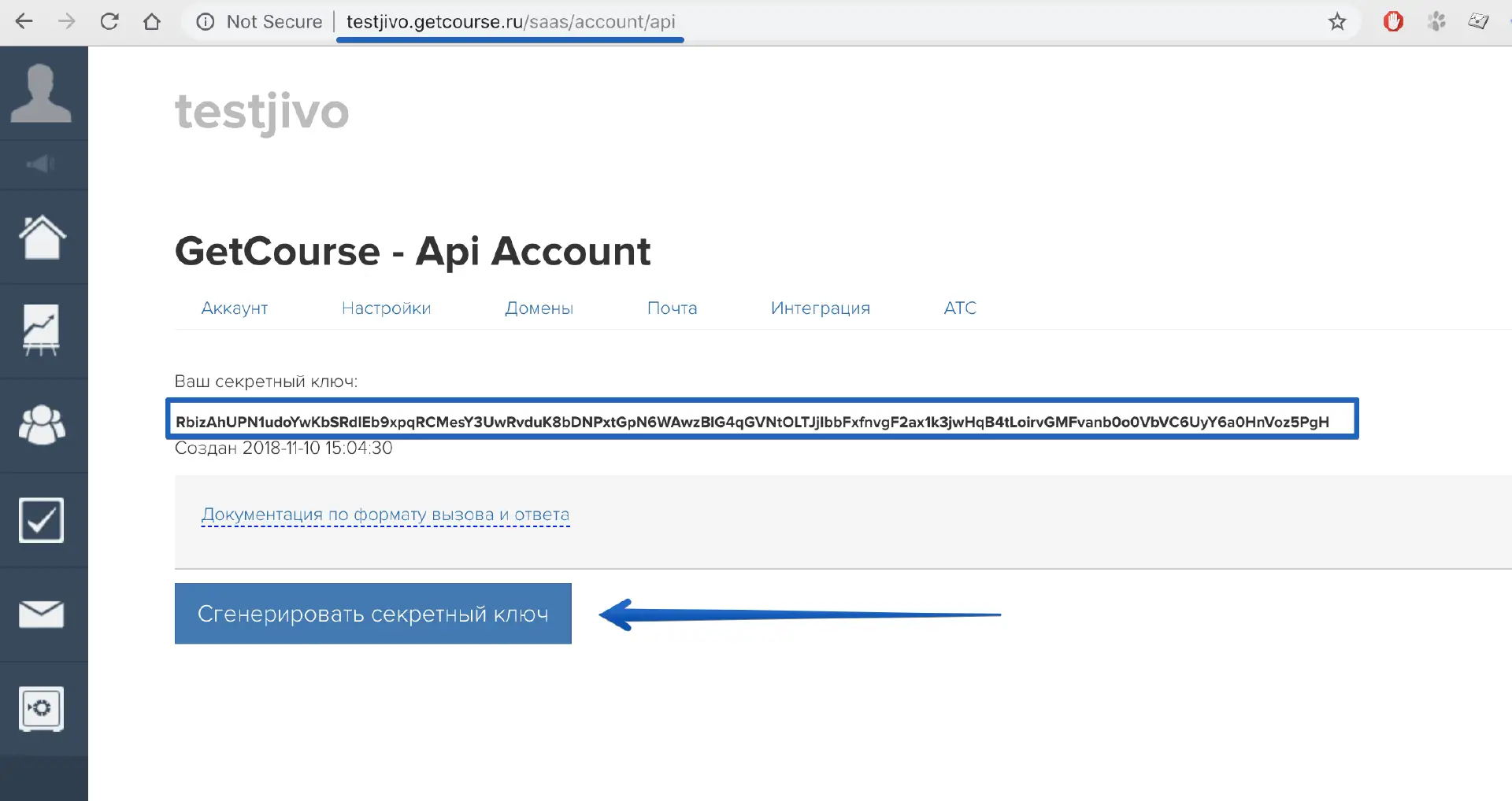 2. Ключ API. Чтобы его получить, нужно вручную ввести в адресной строке адрес следующего вида: http://testjivo.getcourse.ru/saas/account/api, где вместо "testjivo" нужно подставить ваш домен. На странице API, которая откроется по данному адресу, нужно нажать "Сгенерировать секретный ключ". Получившийся ключ и есть необходимый нам в ключ API.
