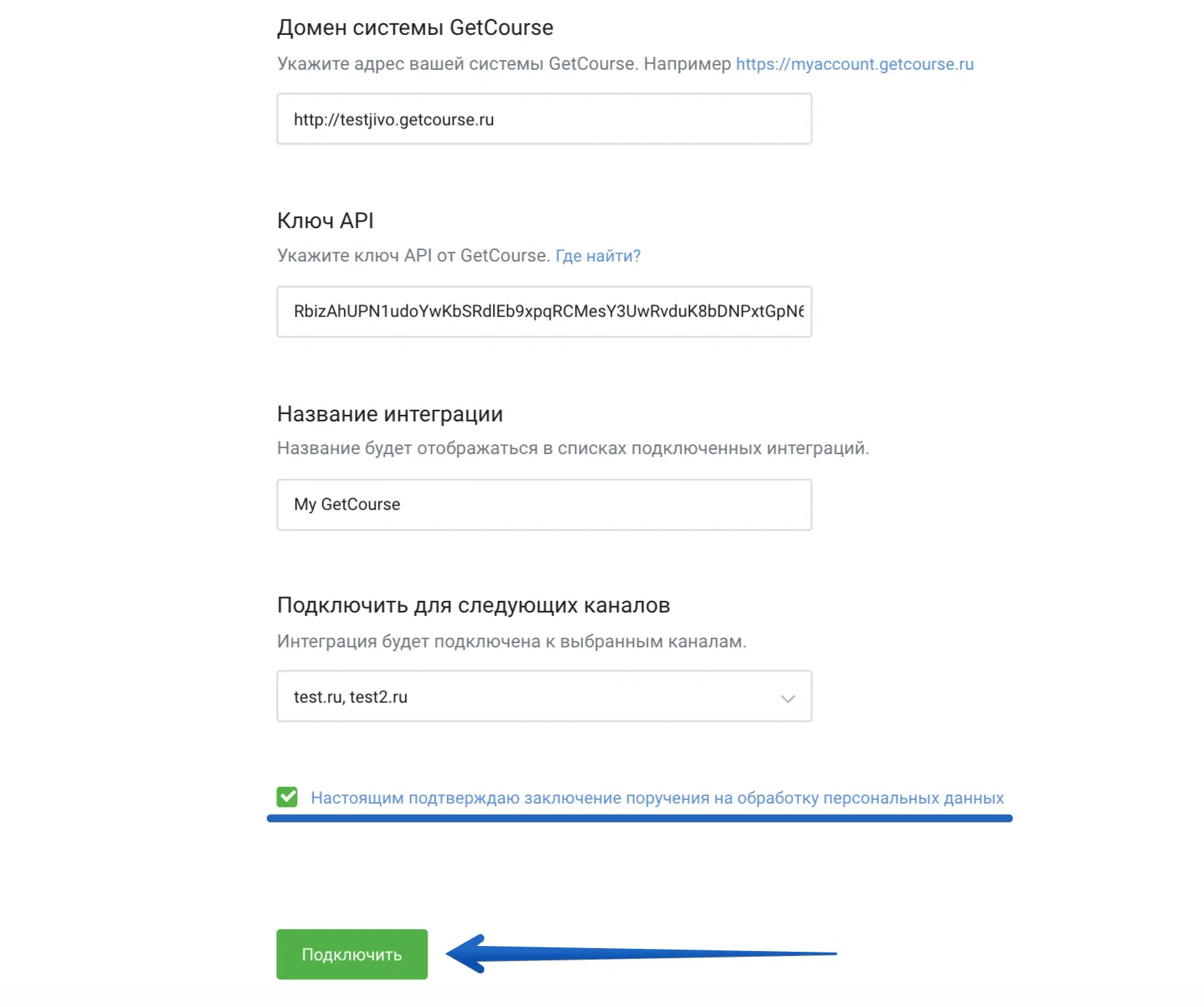 "1. Домен системы GetCourse". Им является адрес вашей системы в GetCourse, например: http://testjivo.getcourse.ru Его можно скопировать из адресной строки.