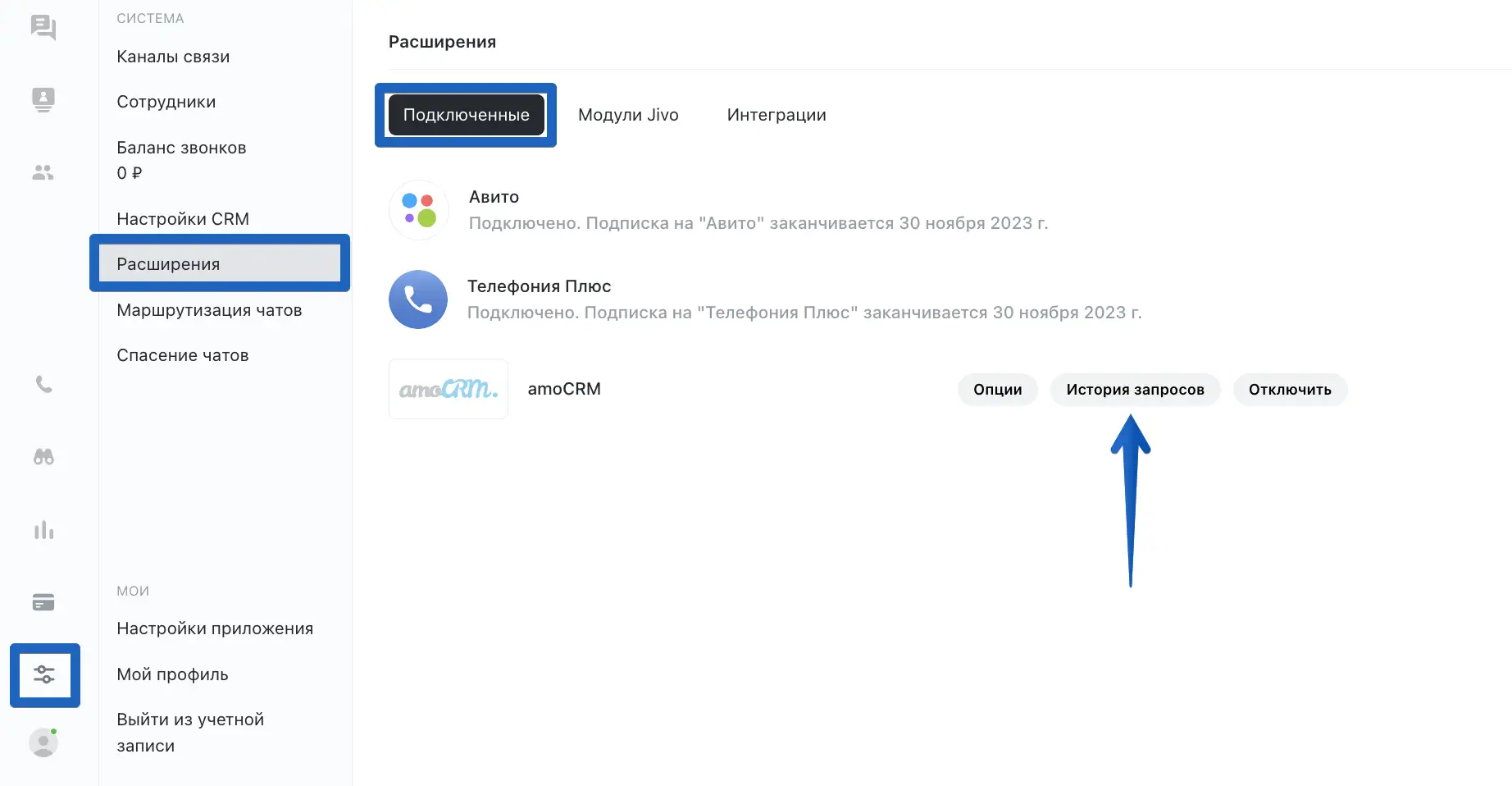 Для подключения интеграции откройте приложение Jivo, перейдите в раздел "Управление" > "Расширения" > "Подключенные" и нажмите "История запросов" рядом с одной из подключенных CRM.