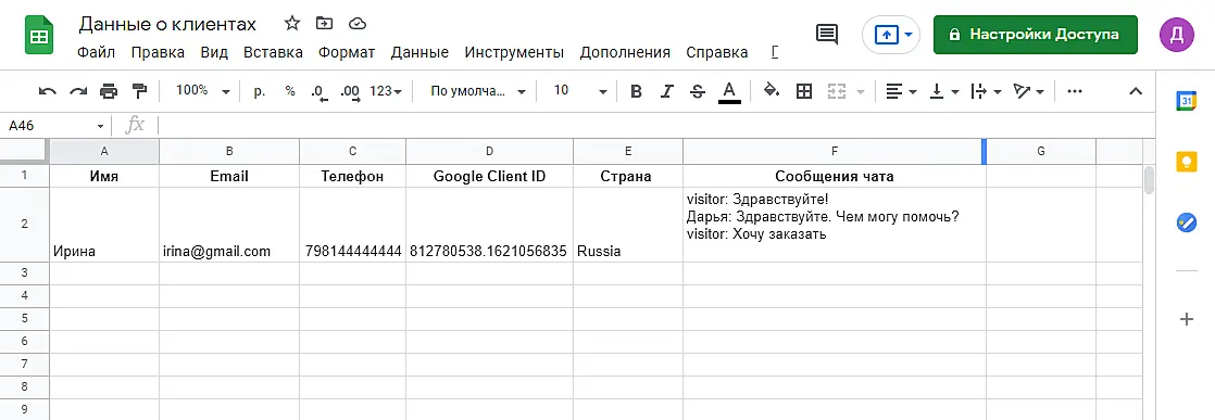 Теперь можете тестировать: при совершении выбранного действия на стороне Jivo будет автоматически создаваться строка с данными в таблице Google.