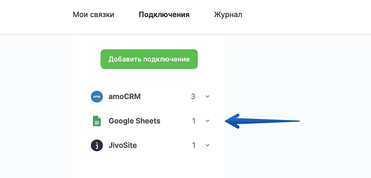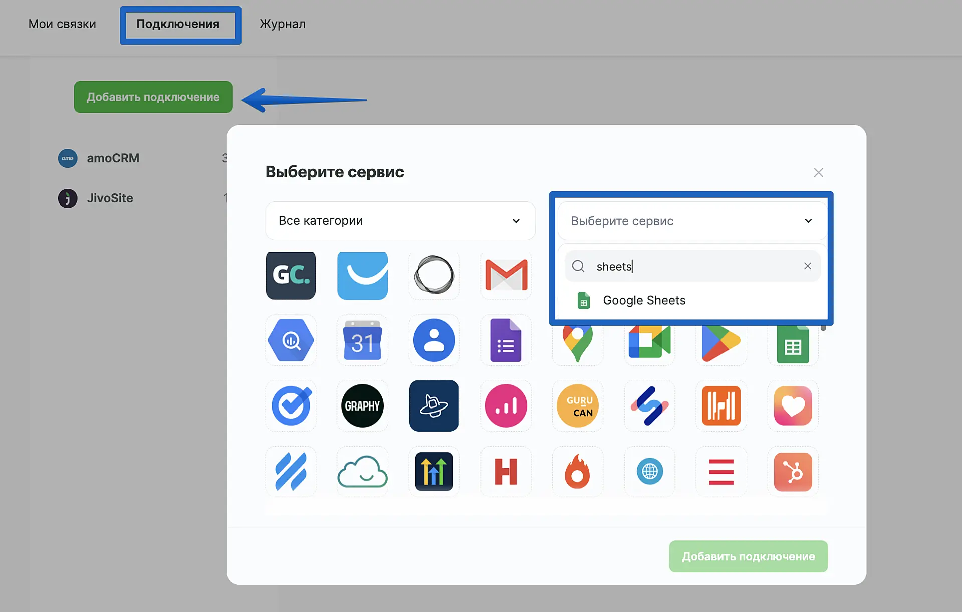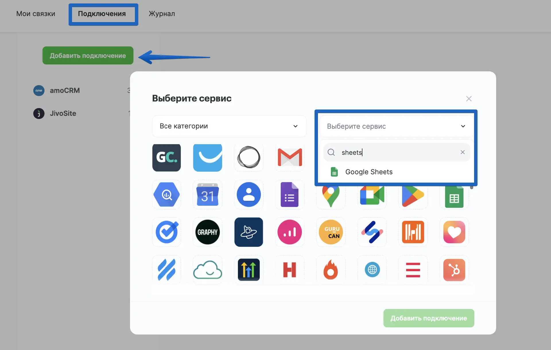 Нажмите на значок Google Sheets и затем на кнопку "Добавить подключение".