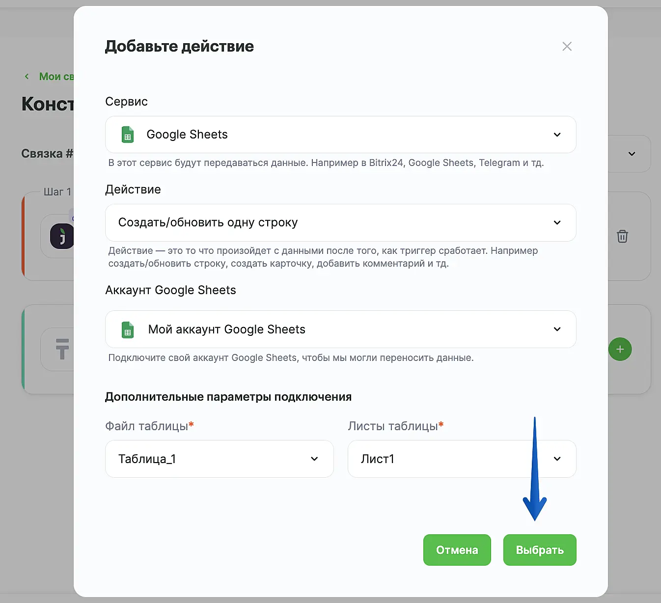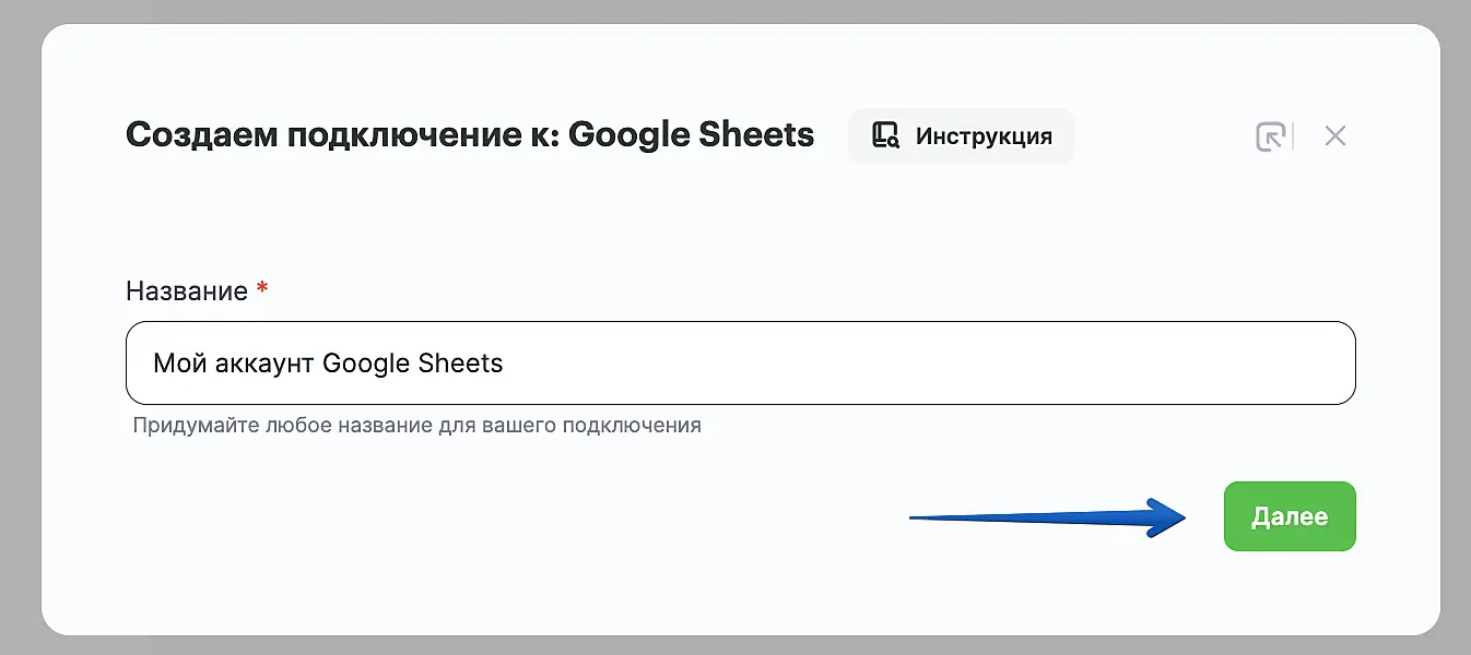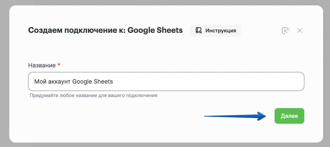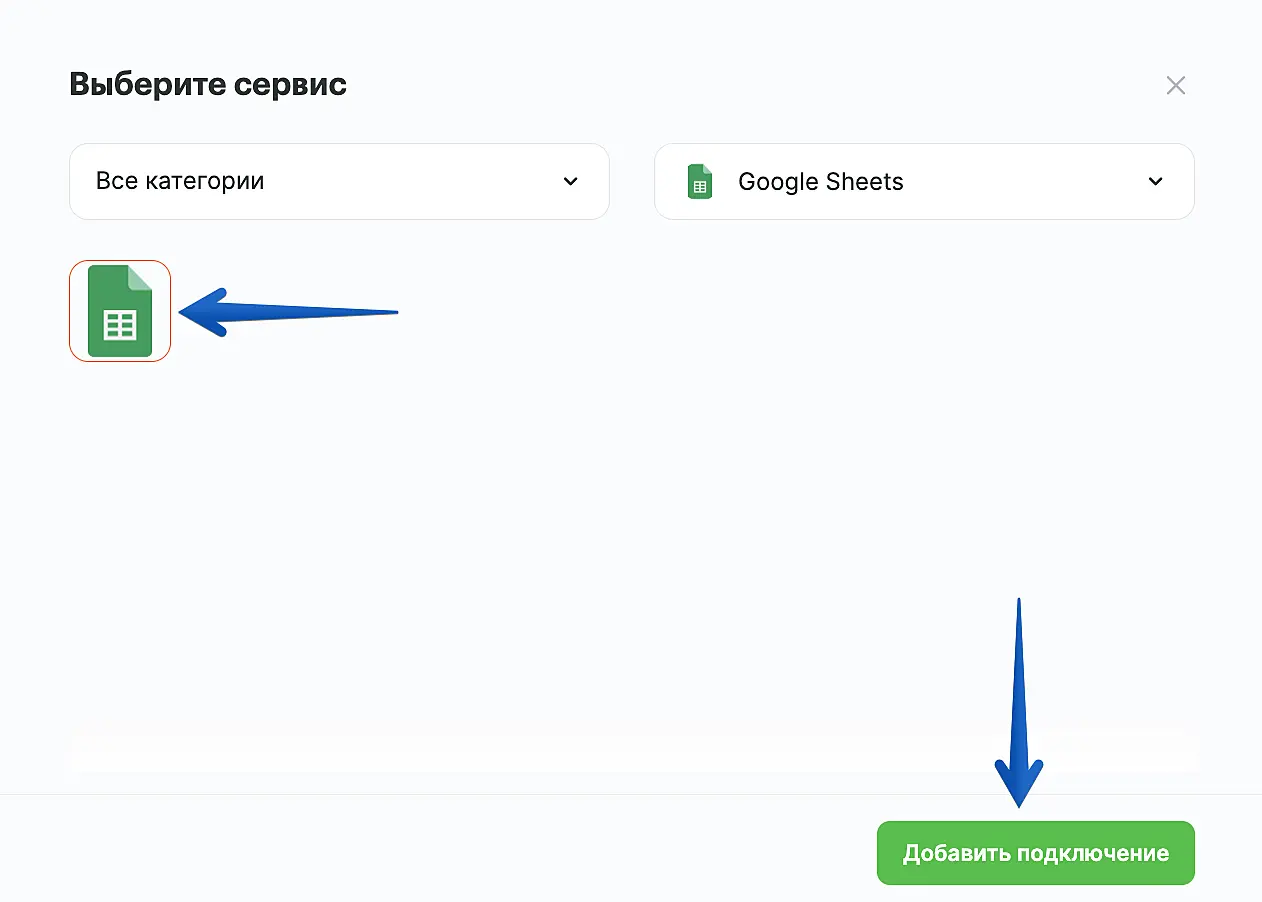 В поле "Сервис" выберите "Google Sheets".