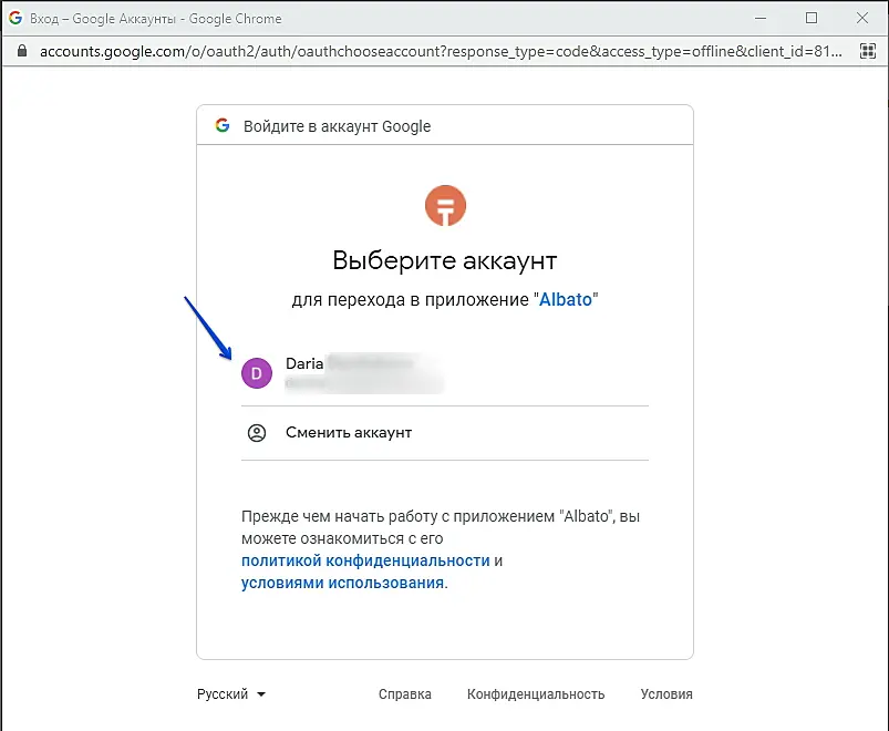 В открывшемся окне авторизуйтесь в Google или выберите нужную учетную запись, если вход в аккаунт уже был совершен в этом браузере: