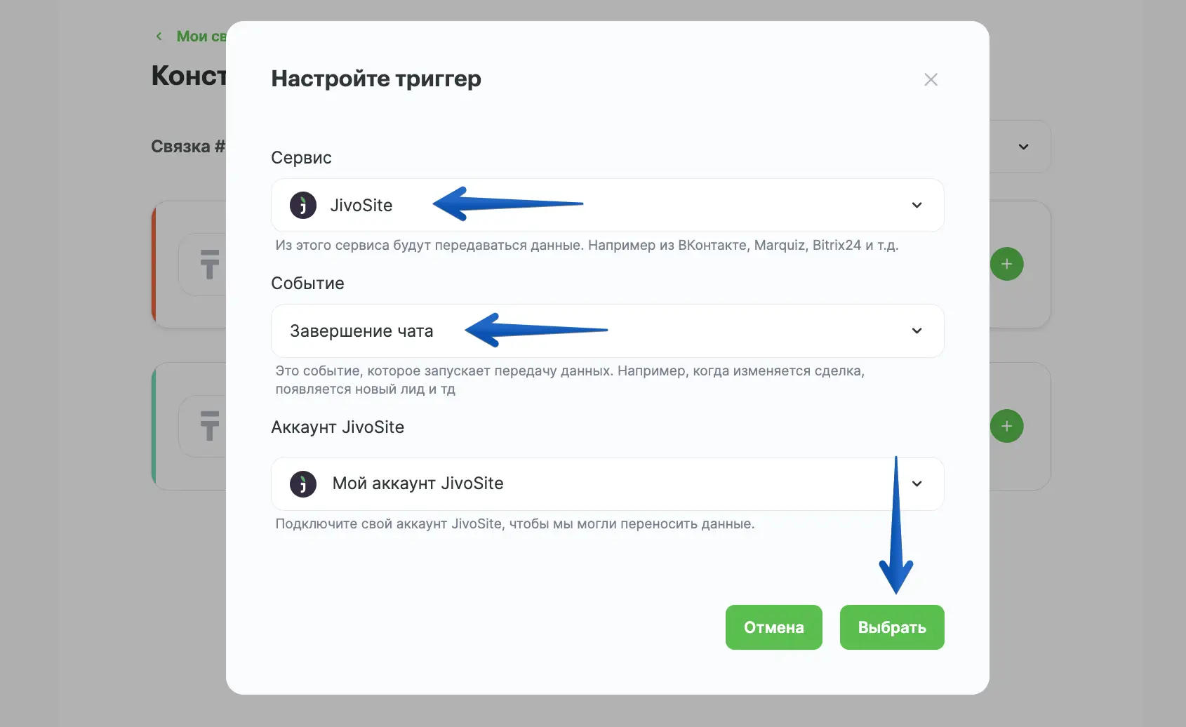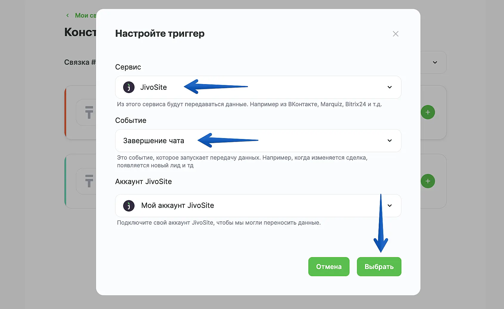 В поле "Сервис" выберите "JivoSite".