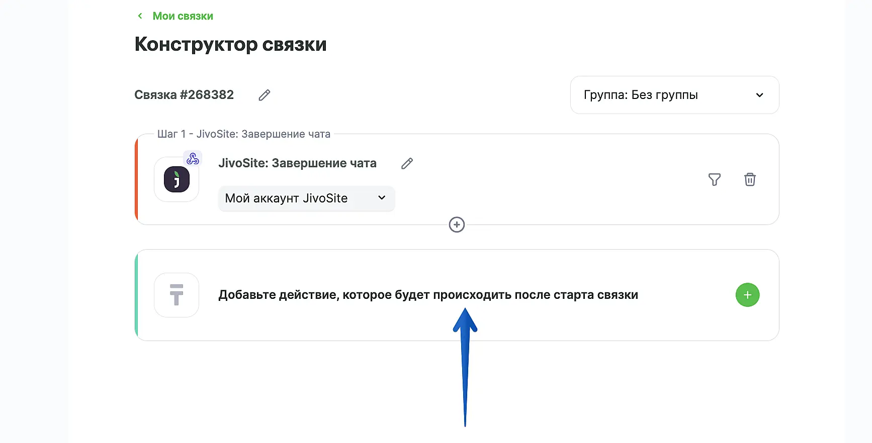 Затем нажмите "Добавьте действие, которое будет происходить после старта связки".