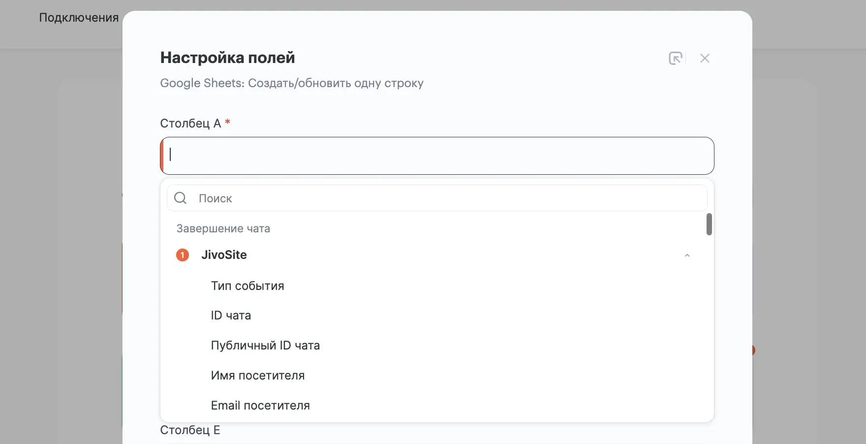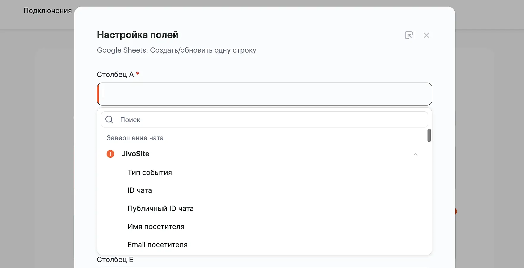 На следующем шаге настройте, какие сущности Jivo в какой столбец таблицы будут передаваться. Для этого нажмите на поле, затем "Jivosite" и выберите нужный тип данных.