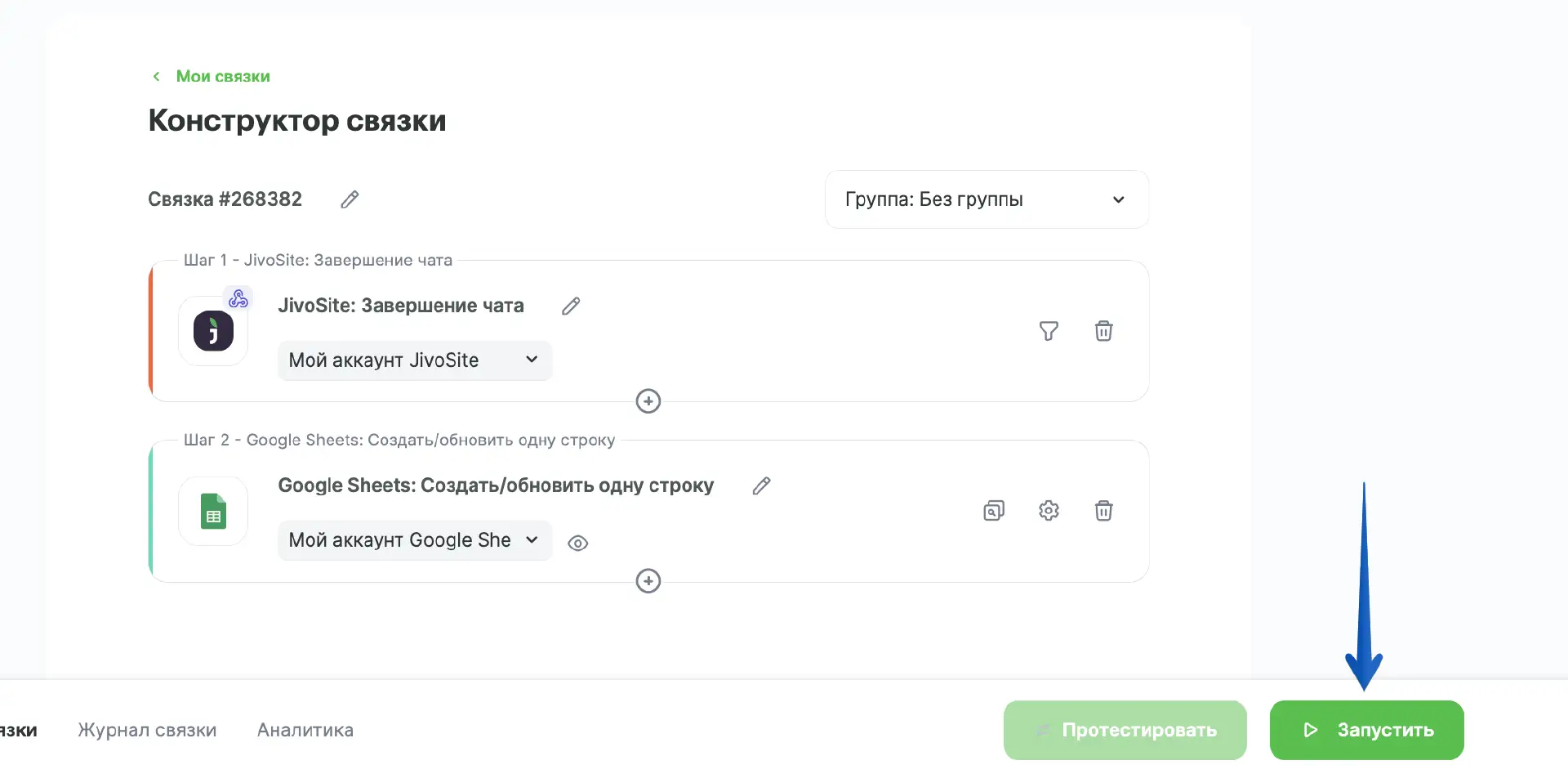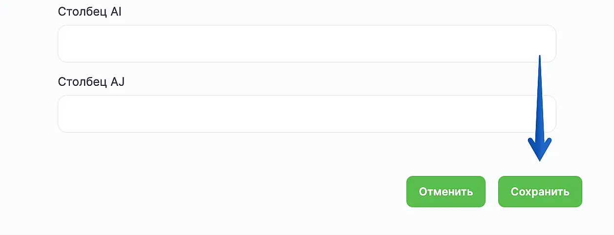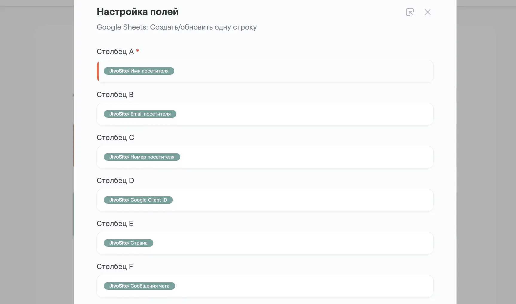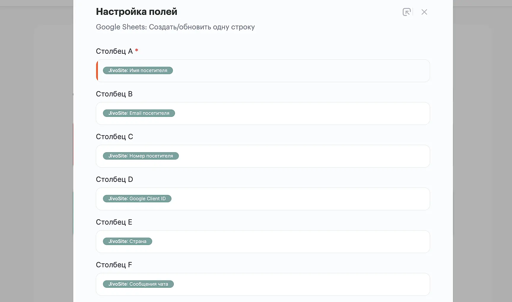 Определенных требований к заполнению полей в этом шаге нет — зависит от того, какие данные вам нужно получать из Jivo в таблицу. Обязательным к заполнению является поле "Столбец А", иначе связка не будет работать.