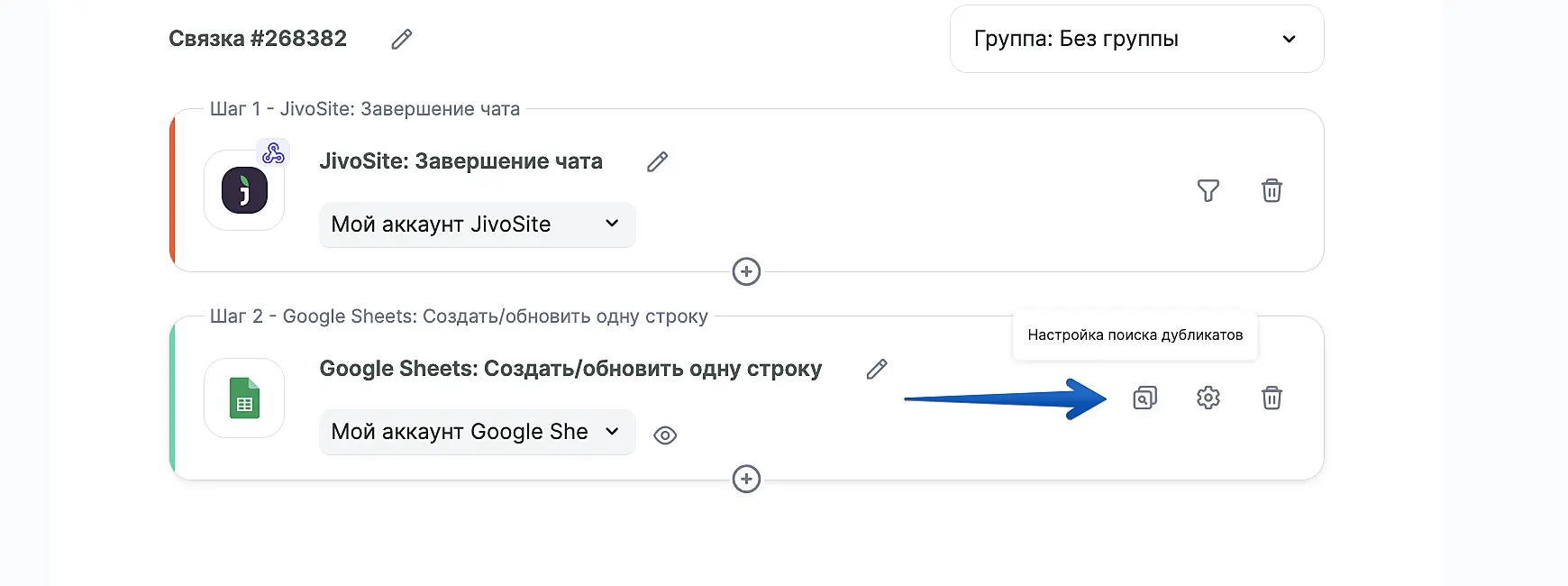 Теперь вы можете настроить проверку на дубликаты. Для этого нажмите на значок поиска напротив действия "Google Sheets".