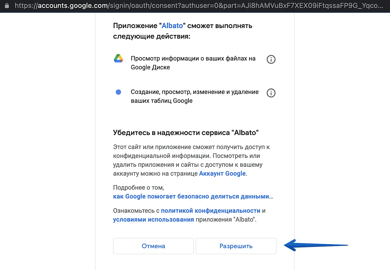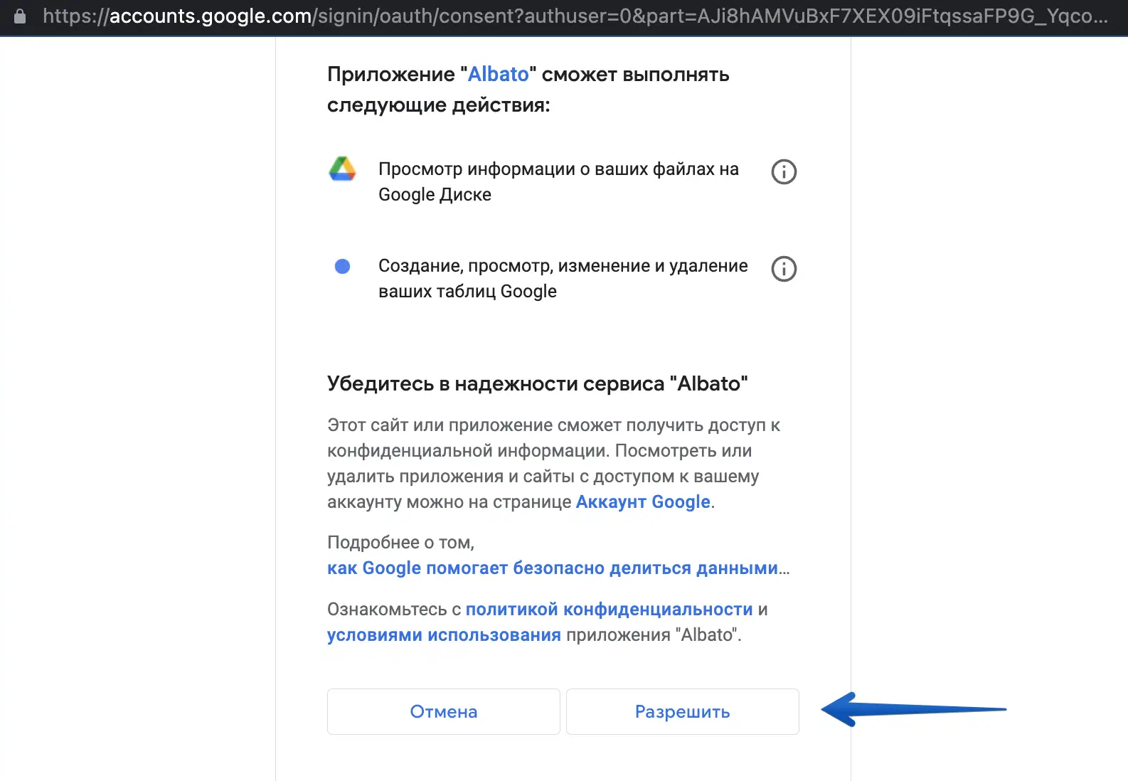 Нажмите кнопку "Разрешить".
