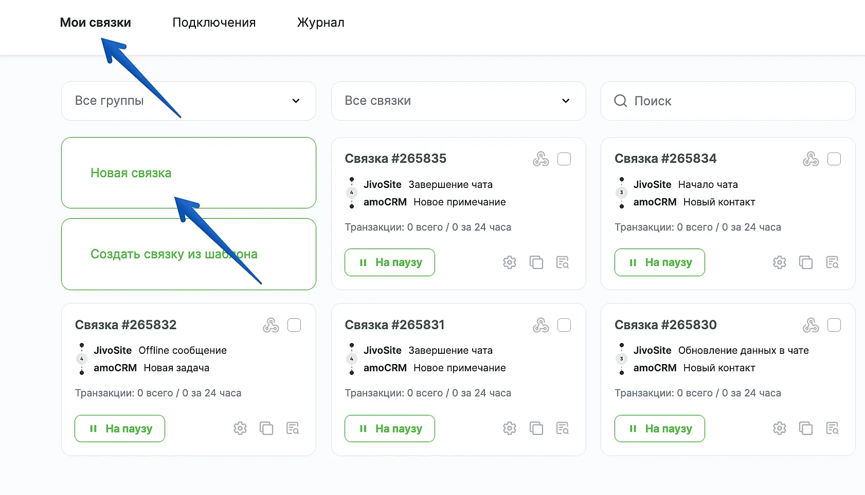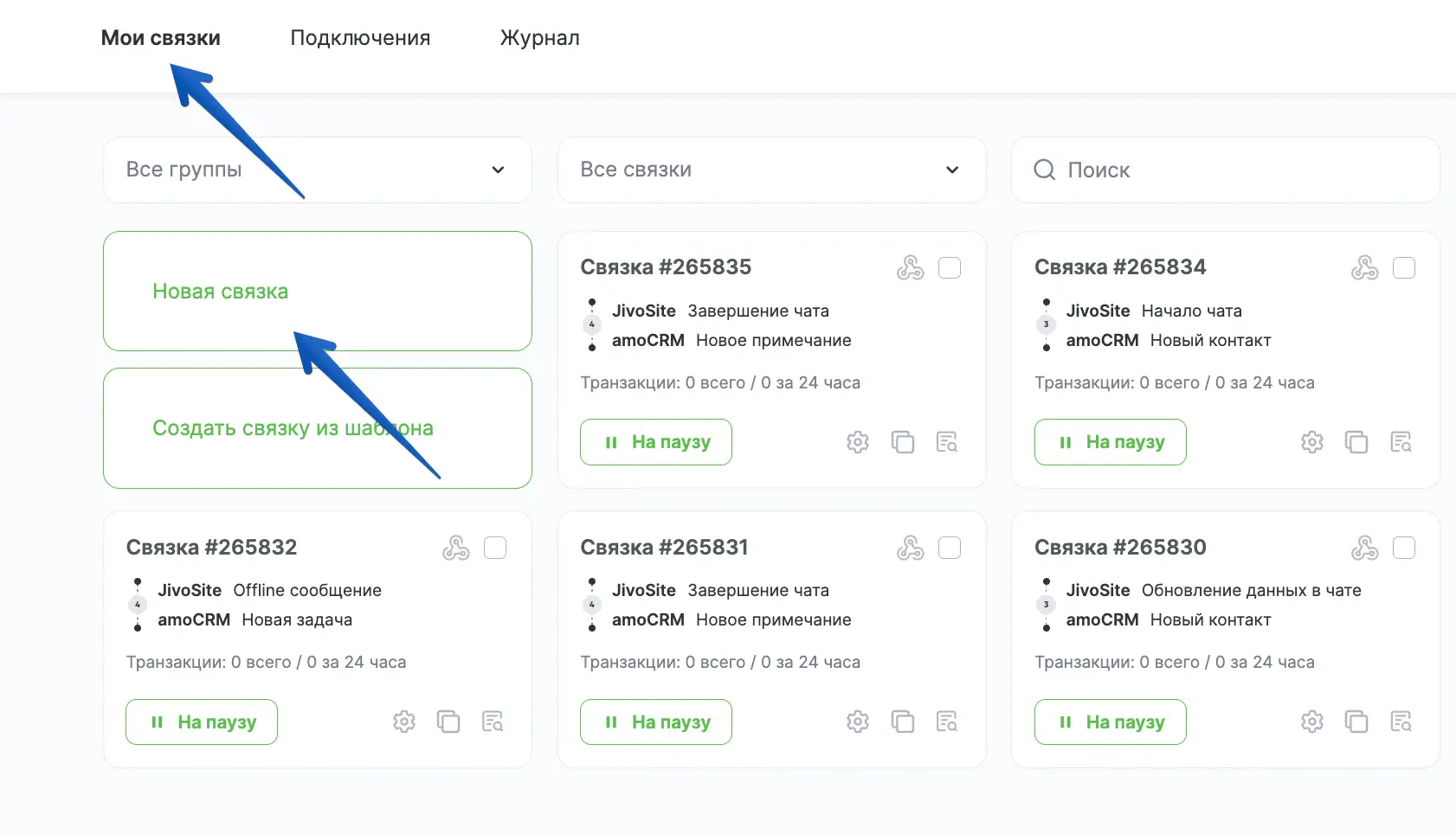 Далее перейдите в раздел "Мои связки" и нажмите "Новая связка":