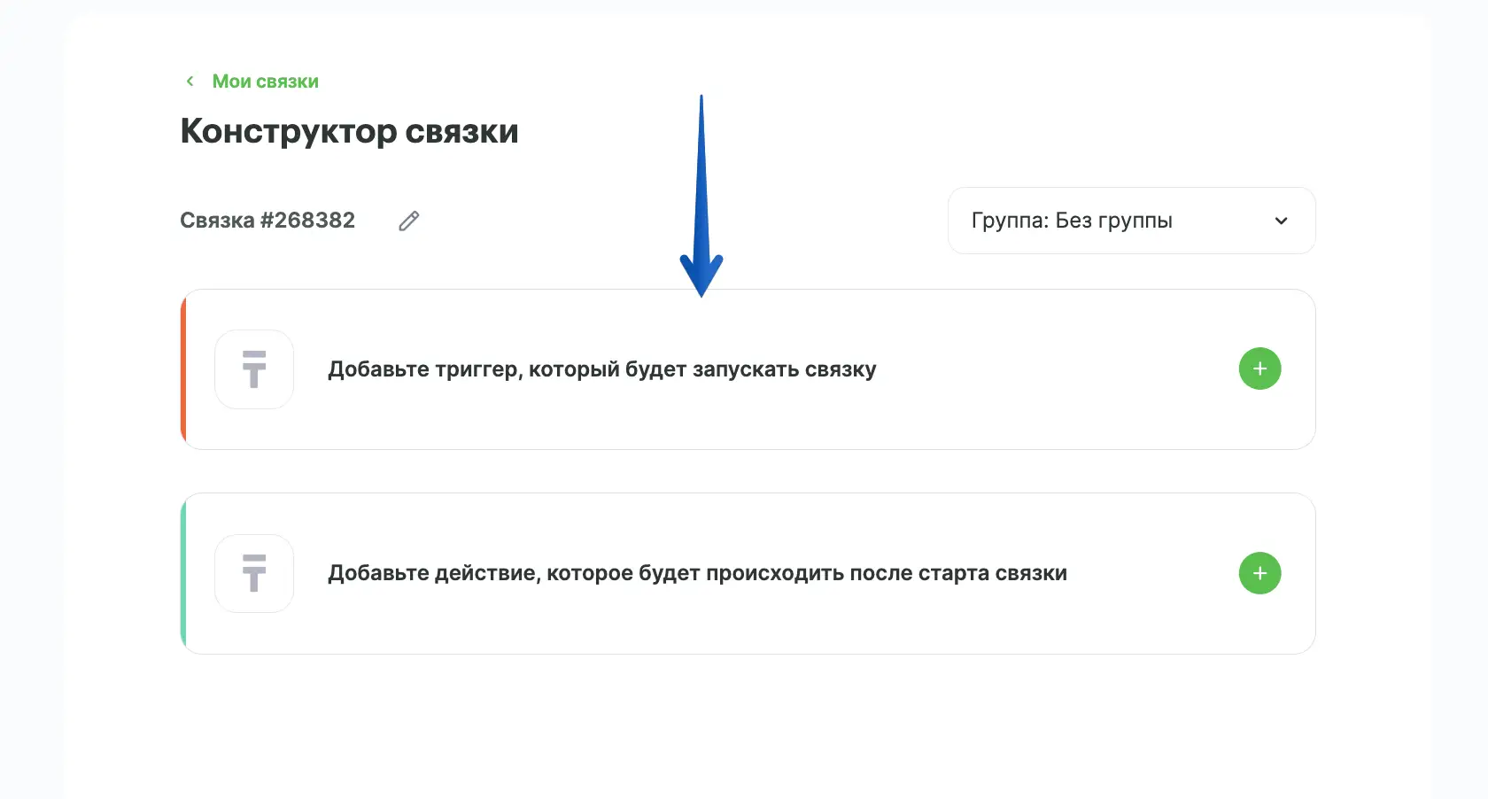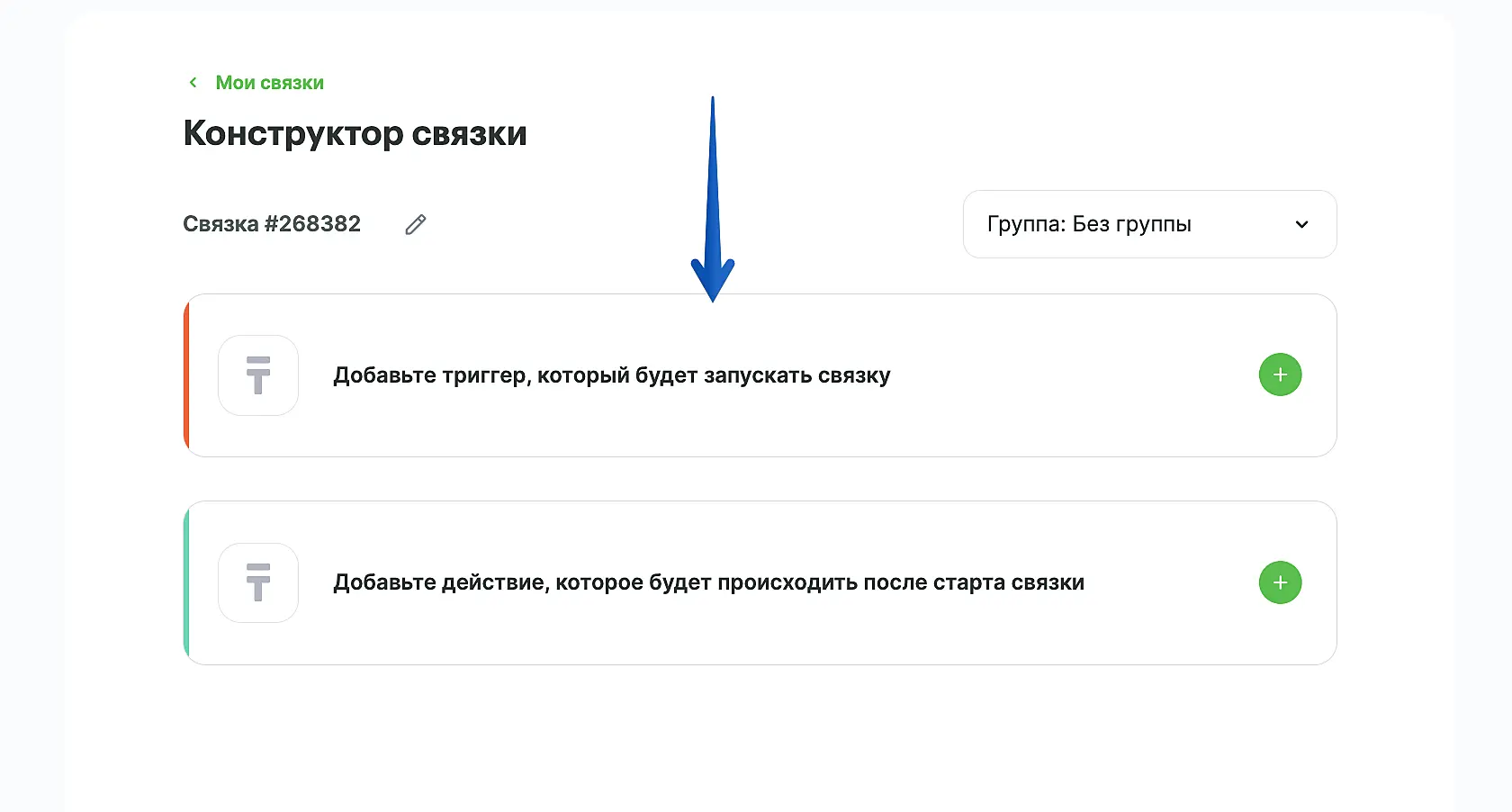 В конструкторе связок нажмите кнопку "Добавьте триггер, который будет запускать связку".