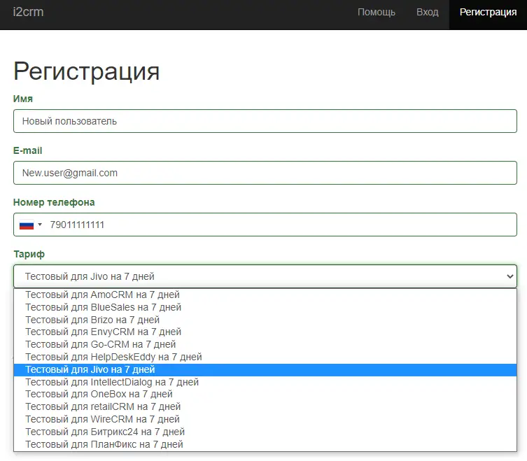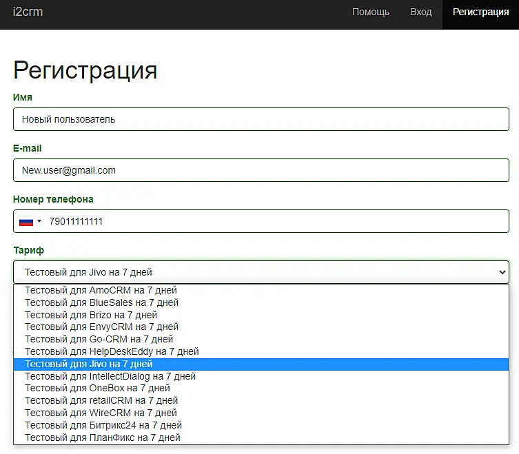 В поле "Номер телефона" укажите реальный номер телефона, чтобы техническая поддержка i2crm, в случае экстренной необходимости, могла с Вами связаться.