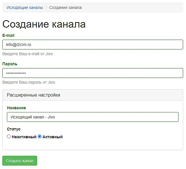Дополнительно можно указать название создаваемого исходящего канала. Если этого не сделать, то название будет сгенерировано автоматически: Jivo ﹣"указанный адрес электронной почты". После заполнения всех необходимых полей - нажмите на кнопку "Создать канал".