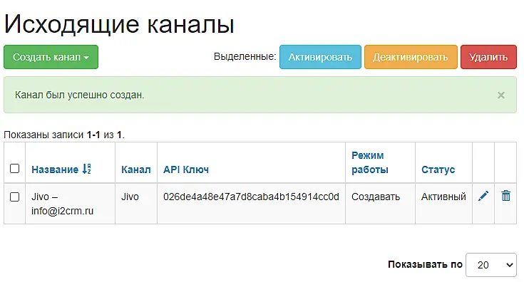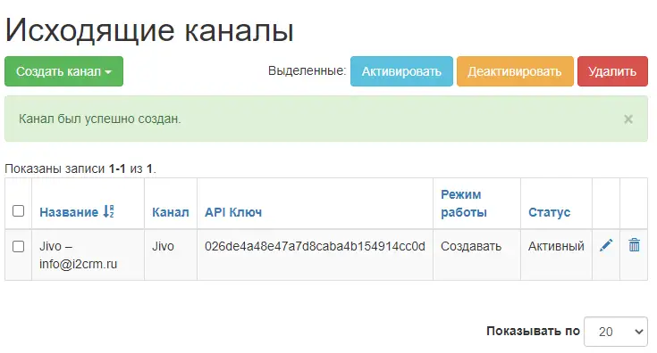 Созданный канал Вы сможете увидеть и настроить в настройках исходящих каналов.