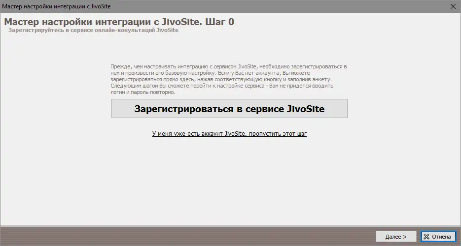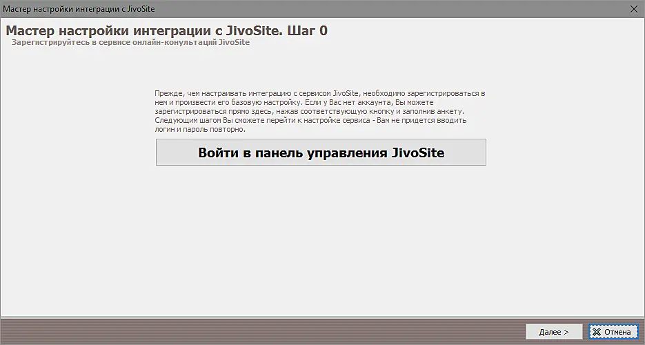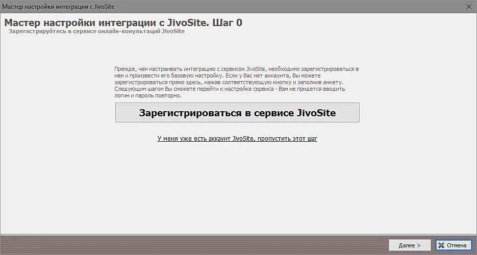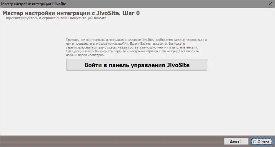 Если у вас еще нет аккаунта, то вы можете пройти регистрацию в Jivo прямо из интерфейса CRM: