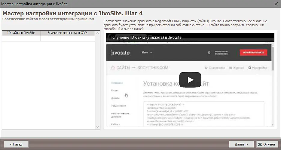 На шаге 4 укажите значение ID сайта, где установлен чат и значение признака в CRM, который был указан на шаге 1.