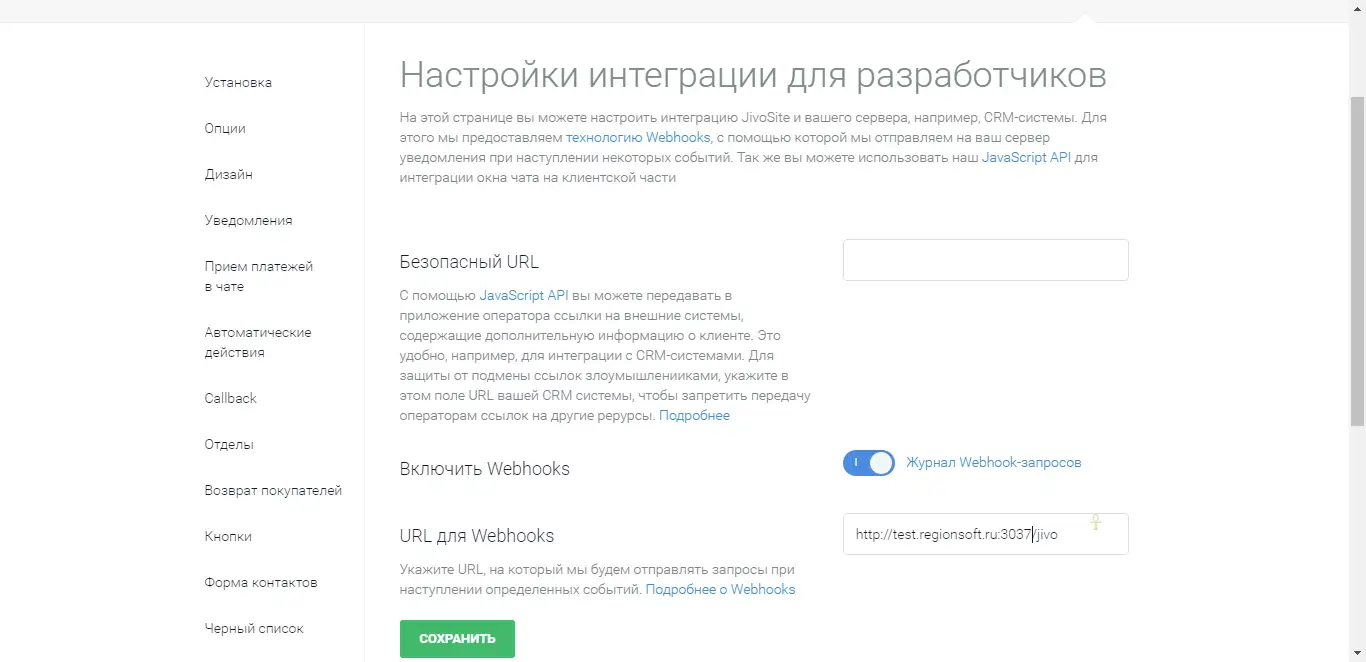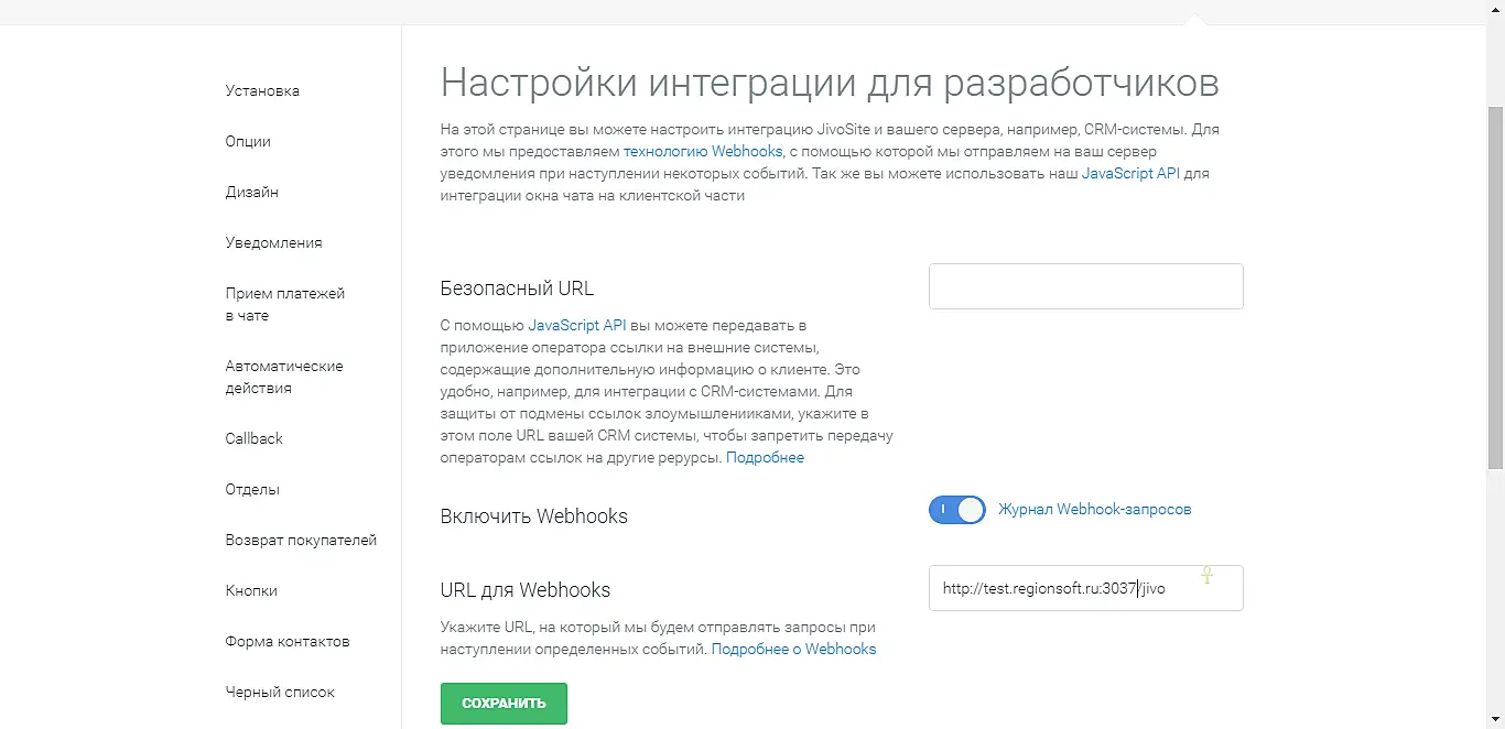 После этого перейдите в приложение Jivo -> Управление -> Каналы связи -> Настройки сайа -> Настройки интеграции для разработчиков и включите опцию Webhooks, а также укажите адрес вашей CRM с ключом. Вид адреса будет примерно следующий: http://адрес-crm:3037/ключ
