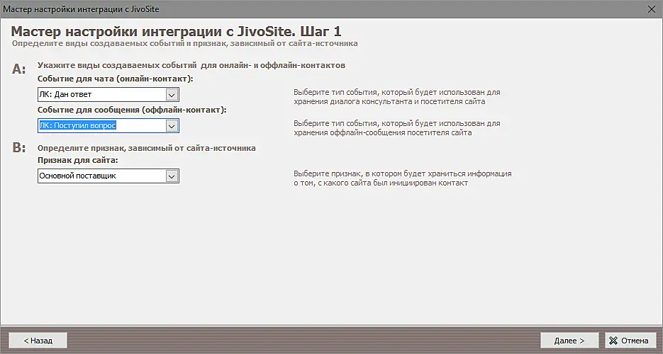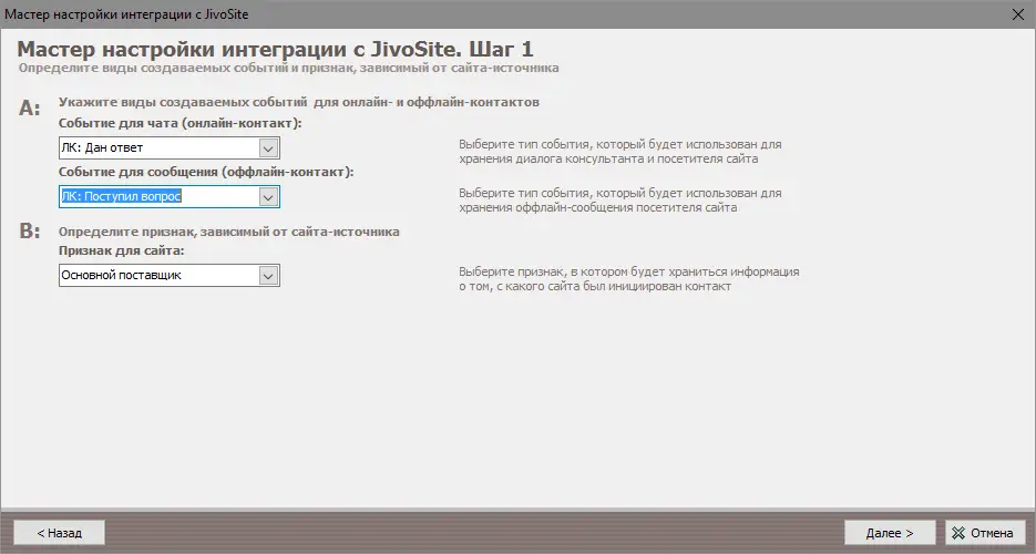 Далее на шаге 1 укажите типы событий, которые будут использоваться в чате, а также выберите признак, по которому будет определяться адрес сайта, где прошел диалог.