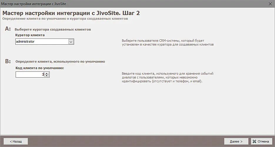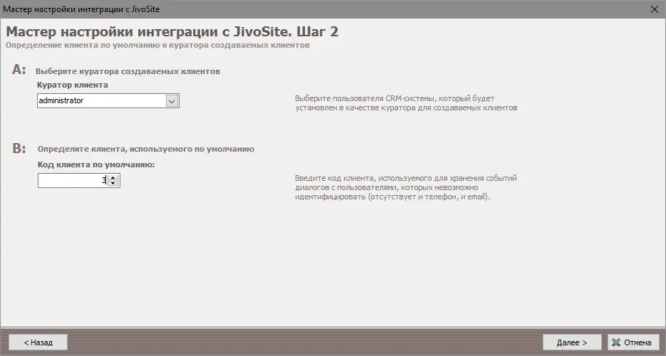 На шаге 2 укажите ответственных за клиента и код клиента, который будет использоваться для определения клиентов, у которых нет контактов.