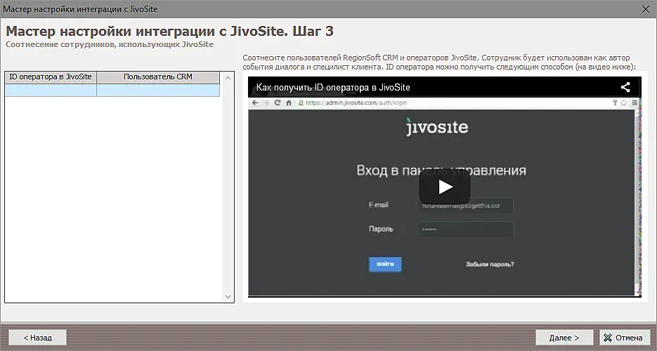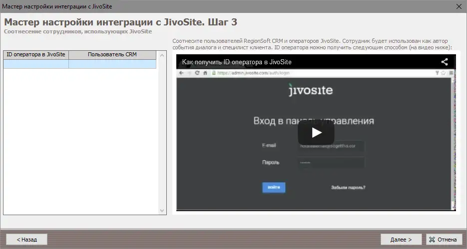 На шаге 3 необходимо будет сопоставить оператора в чате и пользователя в CRM. Также на видео показано как получить ID оператора чата.