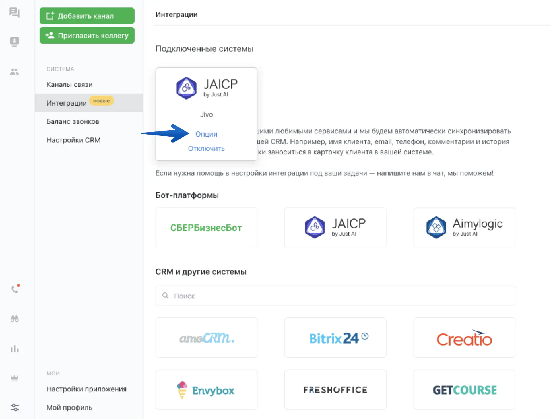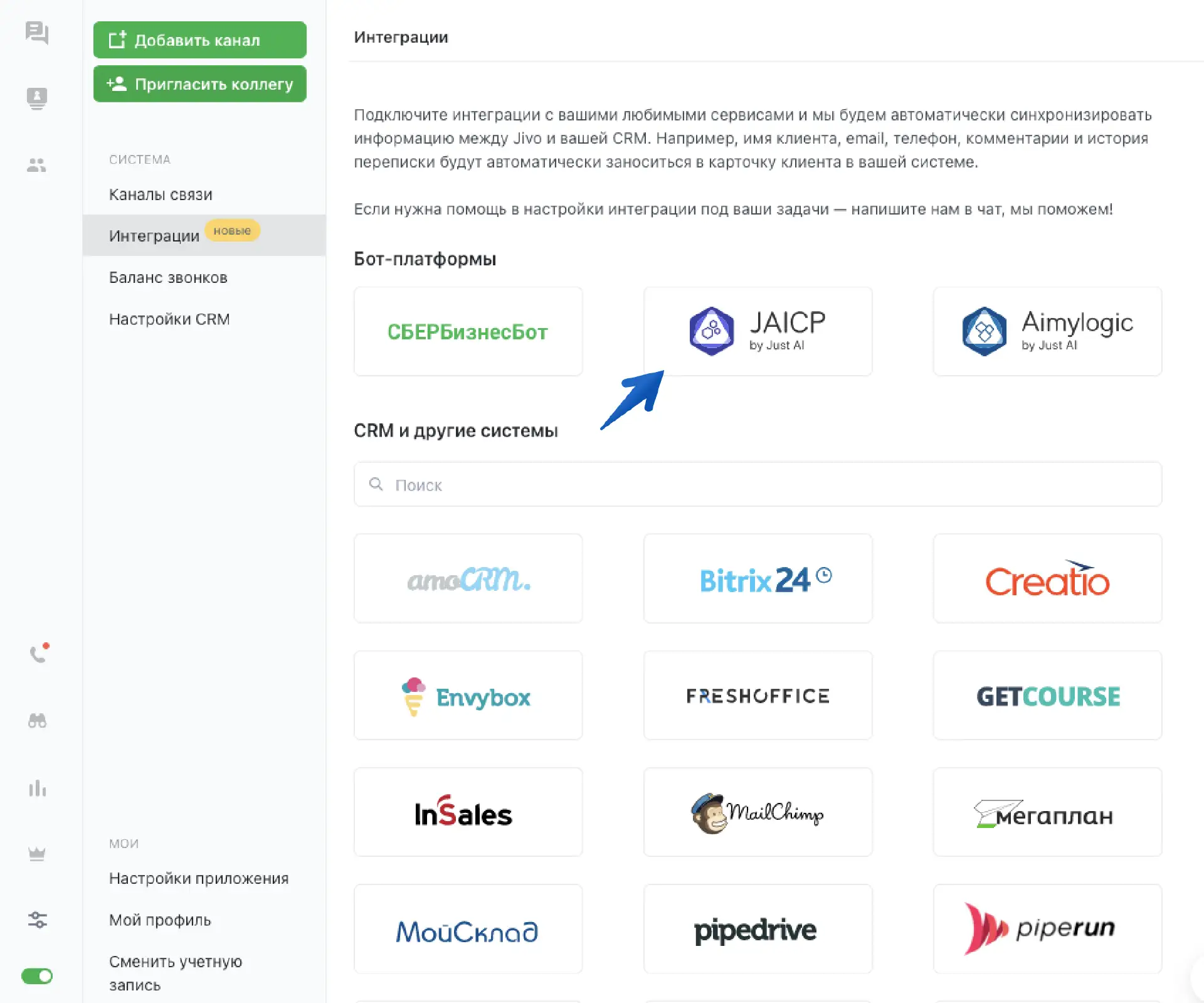 После получения токена, вам необходимо будет зайти в приложение Jivo в раздел Интеграции и выберите JAICP для подключения: