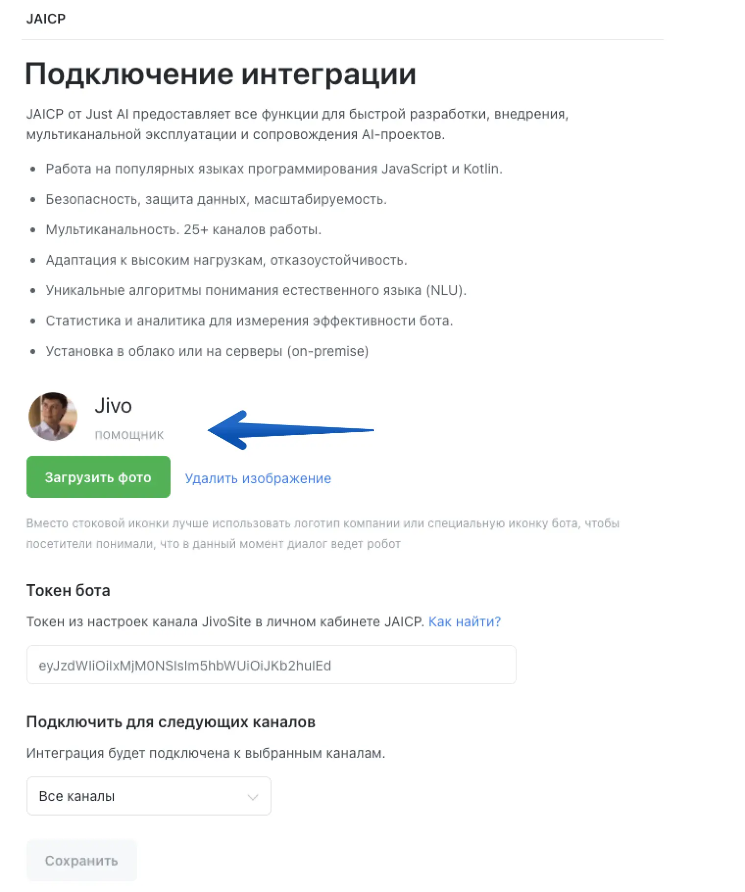 Далее укажите токен бота из ЛК JAICP и выберите на каких каналах связи будет подключен бот:
