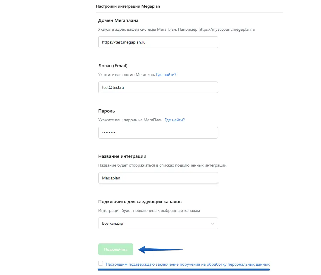 Подключить для следующих каналов. Кликните и отметьте каналы, информацию из которых хотите передавать в "Мегаплан".