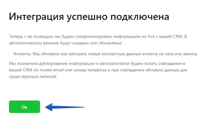 После подключения интеграции вы получите уведомление об успешном подключении. Нажмите "Ок".