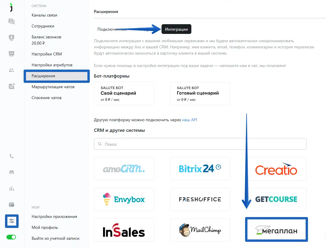 Для подключения интеграции с Мегаплан зайдите в приложение Jivo, раздел "Управление" > "Расширения" > "Интеграции" и выберите "Мегаплан".