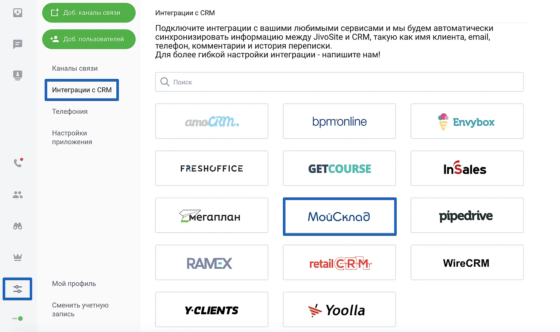 Для подключения интеграции с МойСклад зайдите в приложение Jivo > "Управление" > "Интеграции CRM" и выберите МойСклад.