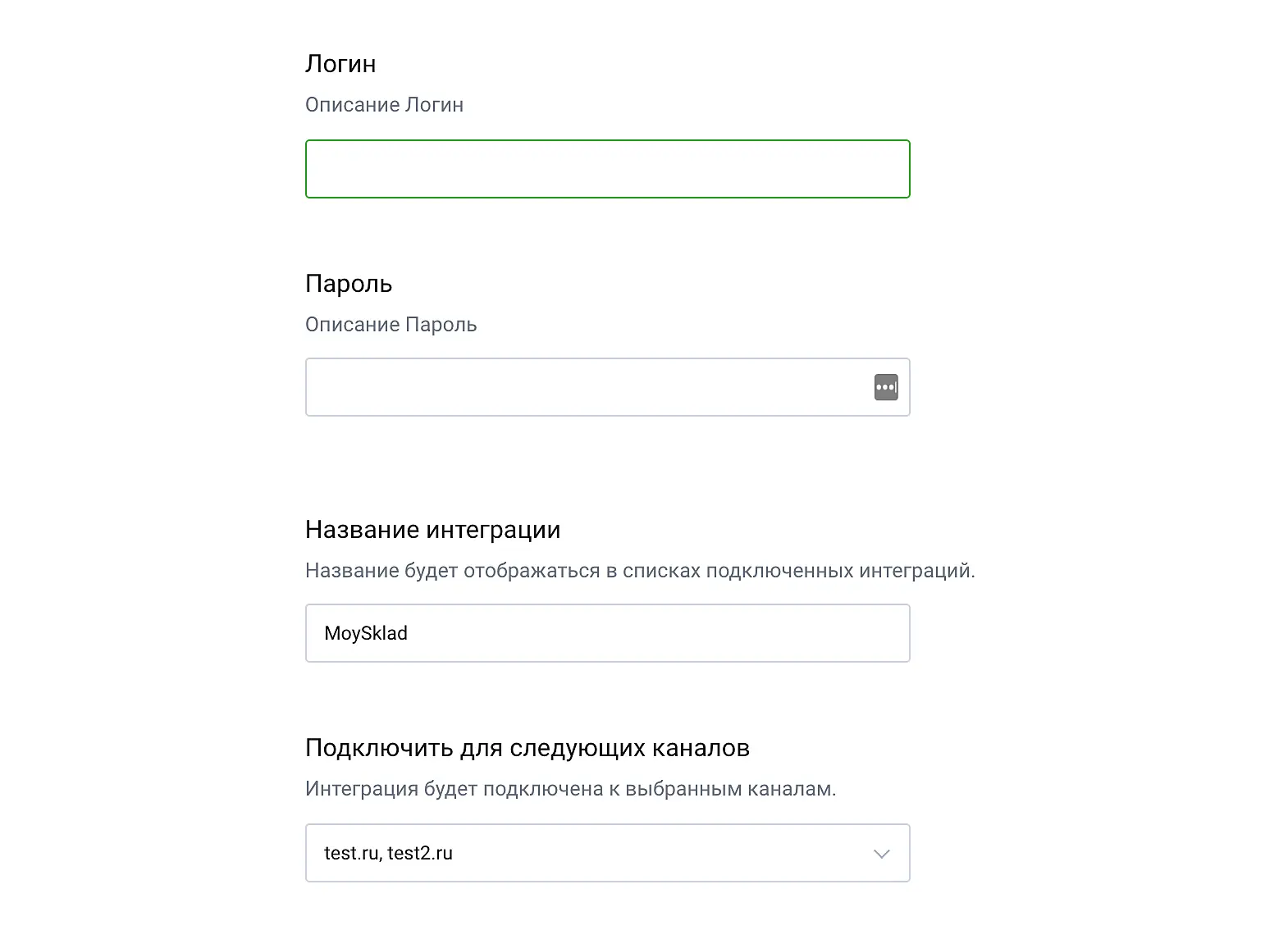 В открывшейся форме подключения интеграции нужно будет заполнить следующие поля: