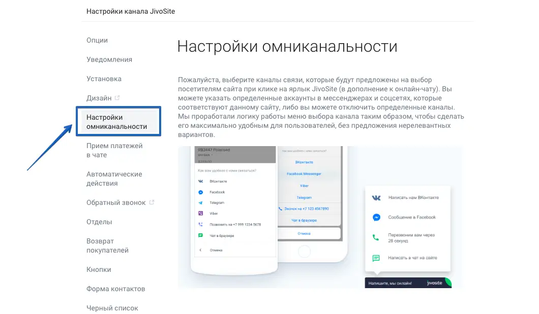 После подключения необходимых каналов зайдите в приложение и перейдите в Управление > Каналы связи. Среди подключенных каналов найдите канал сайта, к чату на котором планируете подключить соц. сети, и нажмите "Настроить".