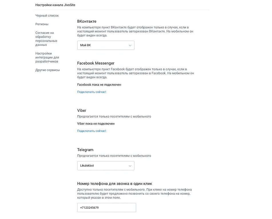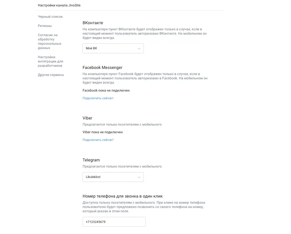 Обратите внимание, что в этом разделе вы также можете указать номер телефона, который будет использоваться в мобильной версии чата, при нажатии на кнопку "Телефон".