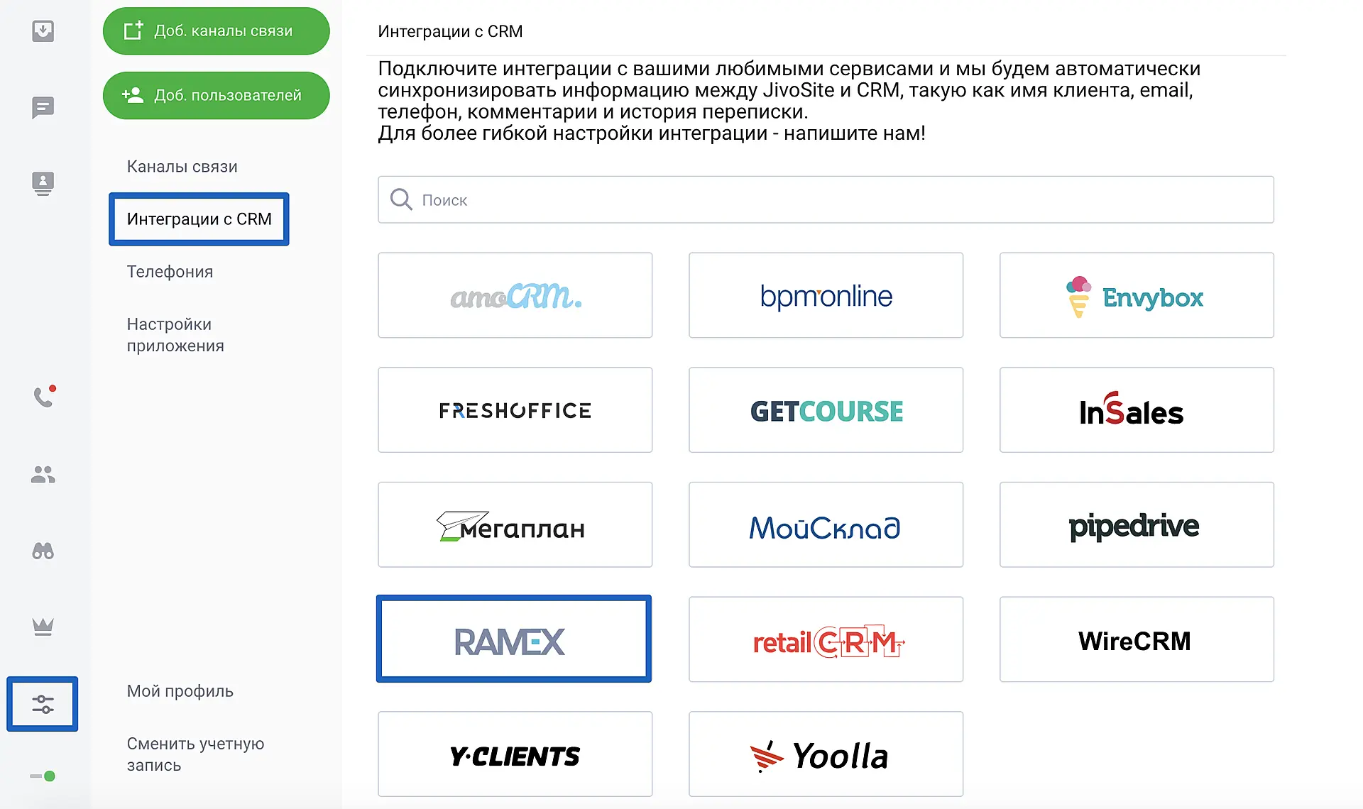 Для подключения интеграции с Ramex зайдите в приложение Jivo > "Управление" > "Интеграции CRM" и выберите Ramex.