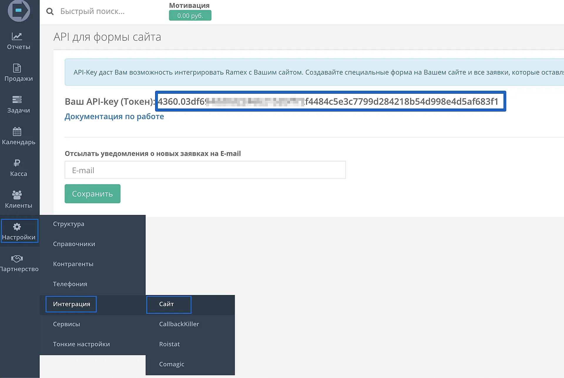 "1. API-key (Токен). Чтобы получить токен, зайдите в вашей системе в Настройки > Интеграция > сайт. Скопируйте ключ с открывшейся страницы и используйте его при заполнении данного поля.