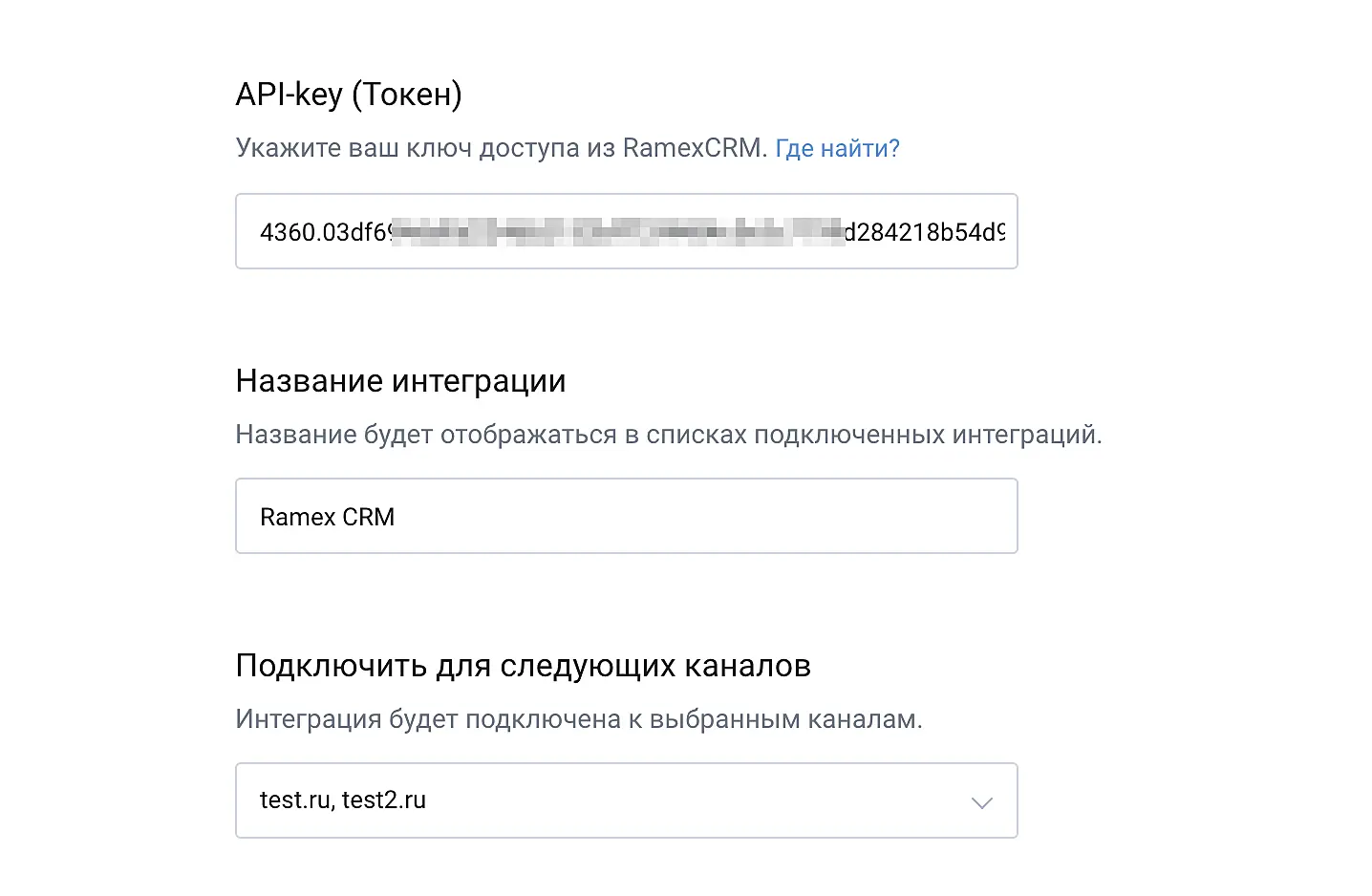 В открывшейся форме подключения интеграции нужно будет заполнить следующие поля: