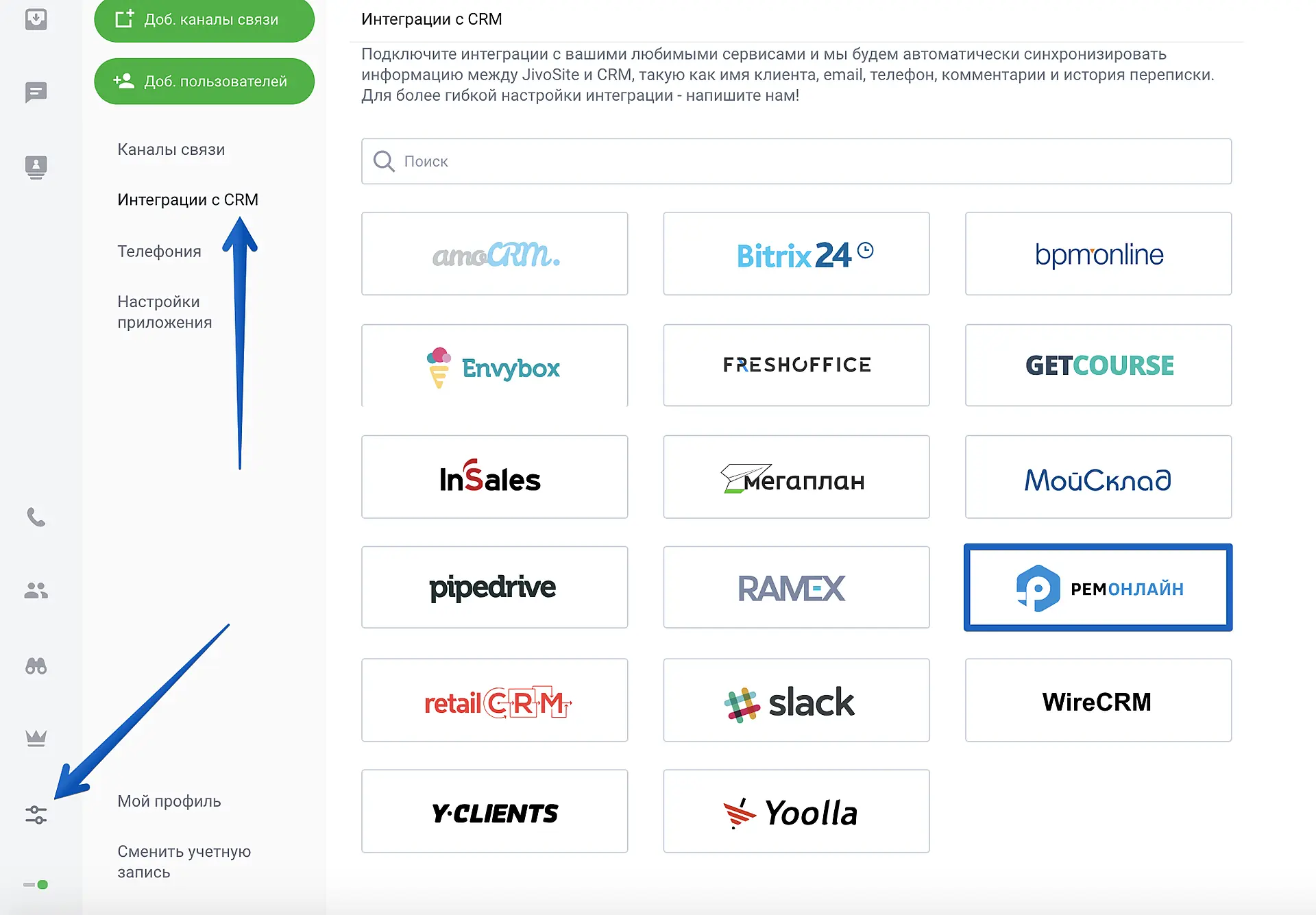 Для подключения интеграции с РемОнлайн зайдите в приложение Jivo > "Управление" > "Интеграции CRM" и выберите РемОнлайн.