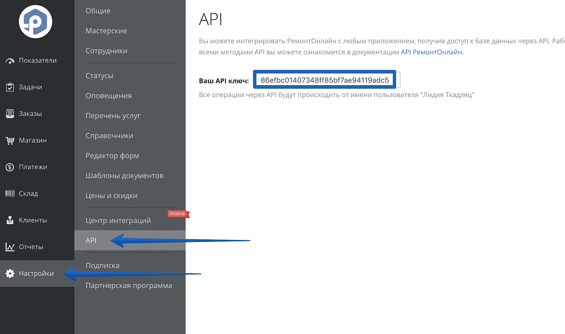 "1. Ключ API. Всё, что необходимо сделать — найти его в настройках учетной записи РемОнлайн. Для этого зайдите в Настройки > API и скопируйте ваш ключ API оттуда.