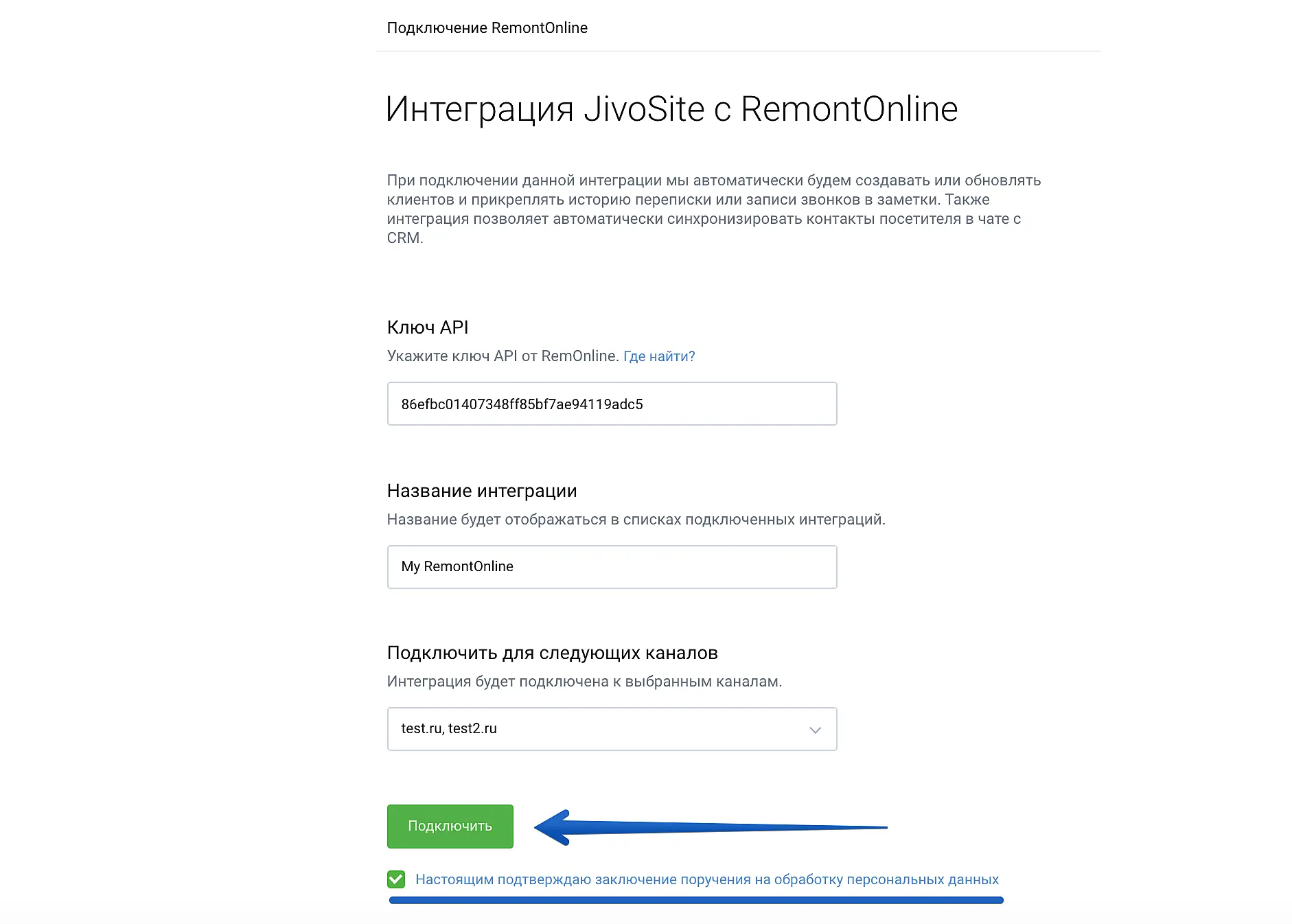 Поставьте галочку в знак подтверждения вашего согласия на обработку персональных данных и нажмите на кнопку "Подключить".