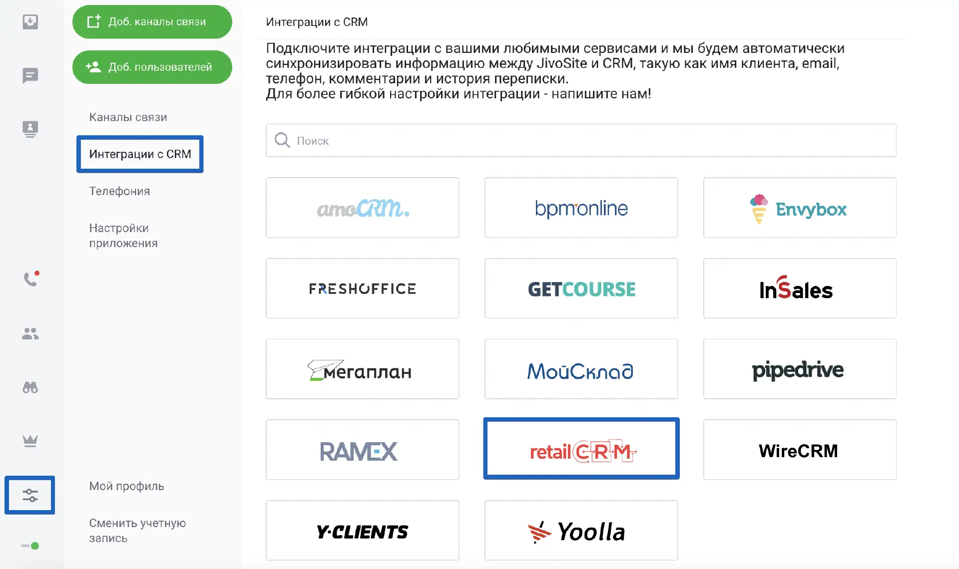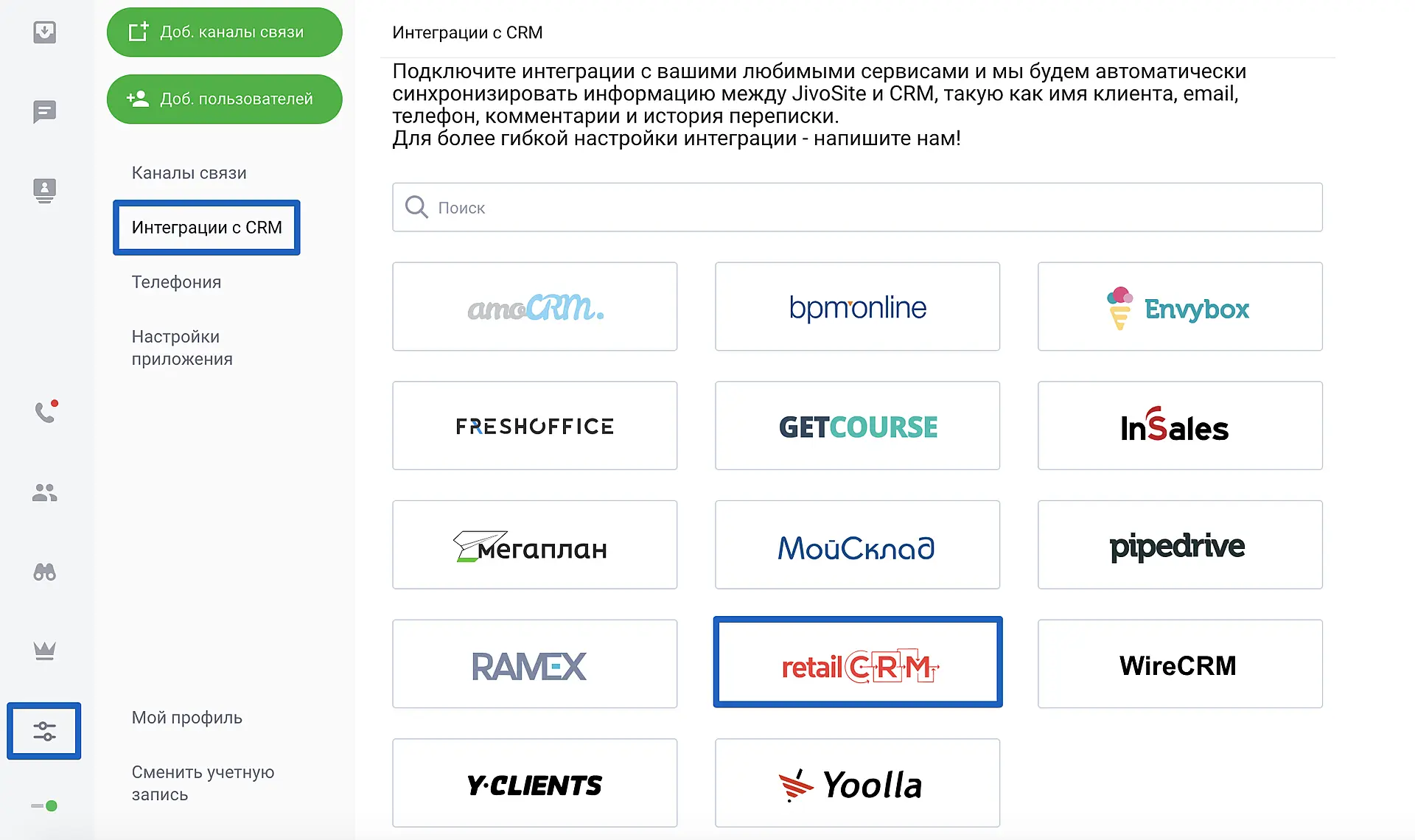 Для подключения интеграции с RetailCRM зайдите в приложение Jivo > "Управление" > "Интеграции CRM" и выберите RetailCRM.