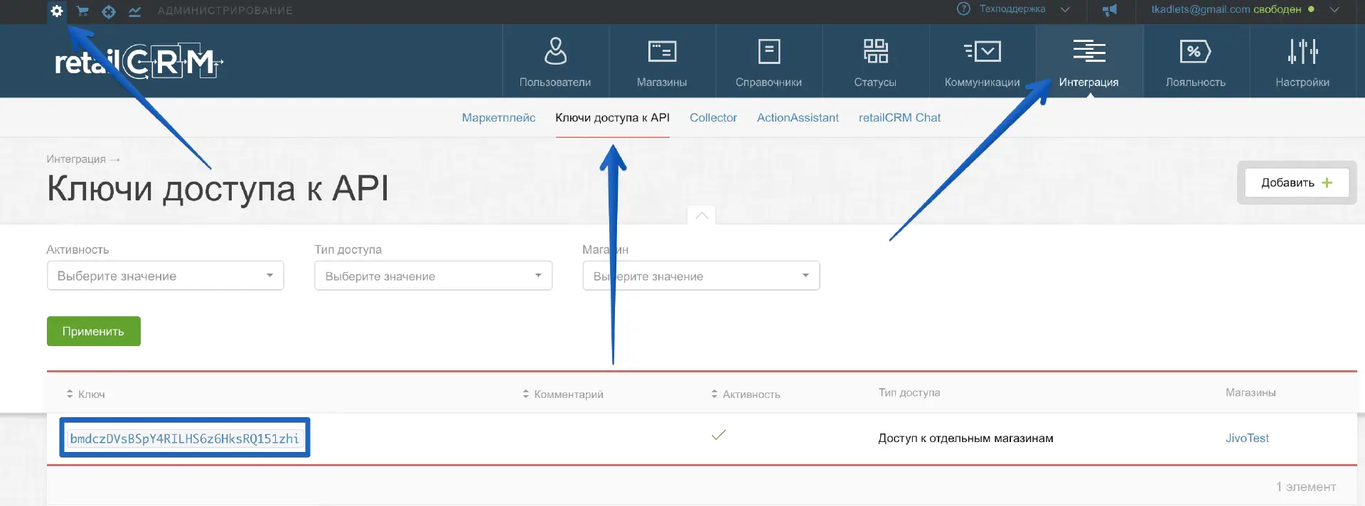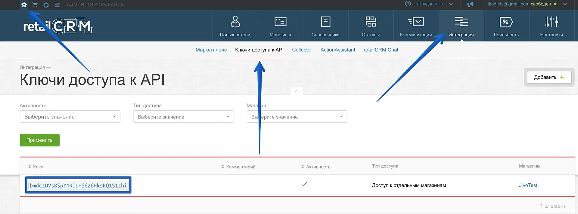 2.Токен API. В вашей системе нажмите на значок настроек в левом верхнем углу, так вы переключитесь в режим администрирования. Затем вам нужно в раздел "Интеграция" > "Ключи доступа к API". Скопируйте ключ с открывшейся страницы и используйте его при заполнении данного поля.