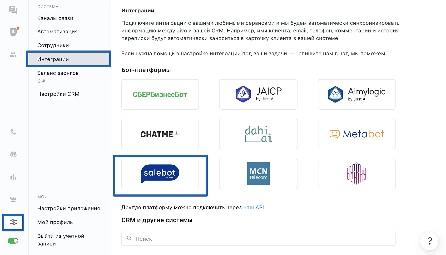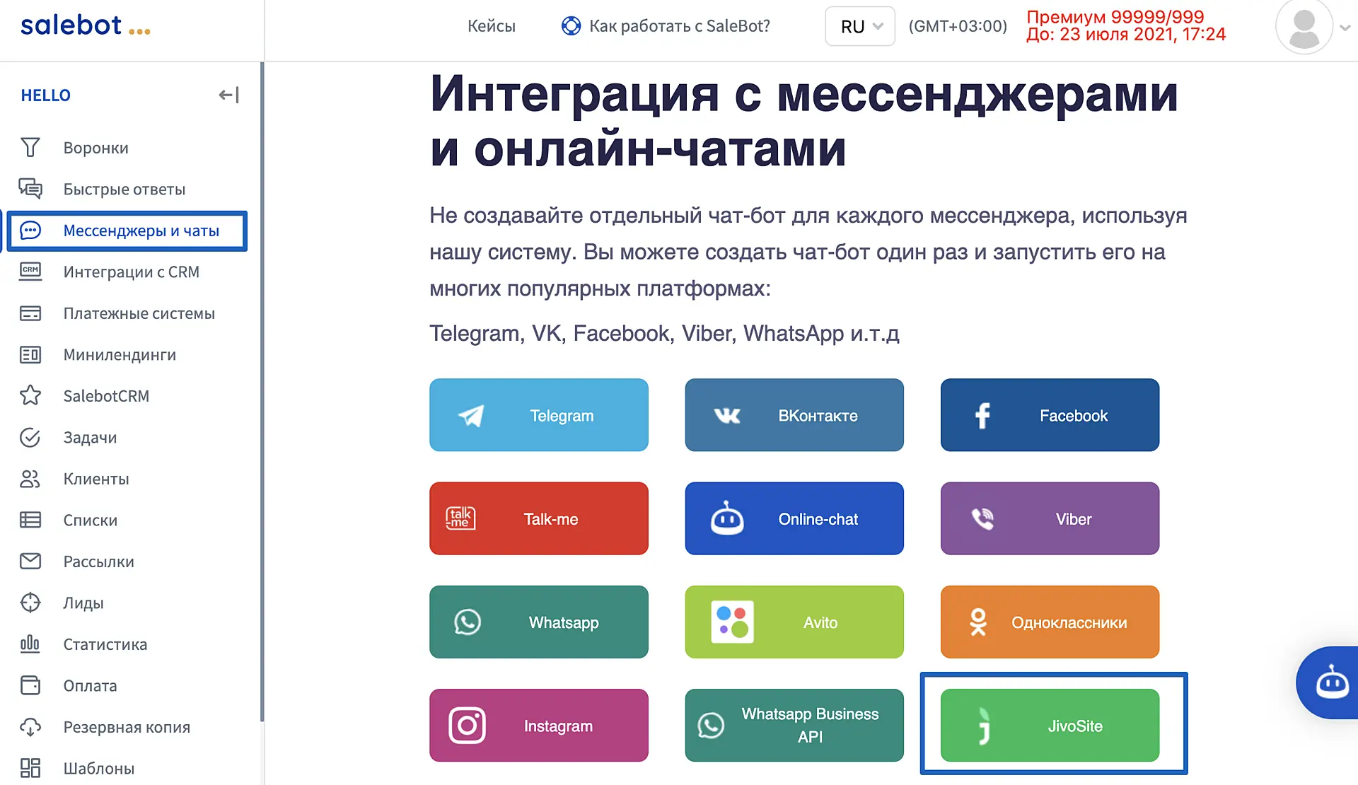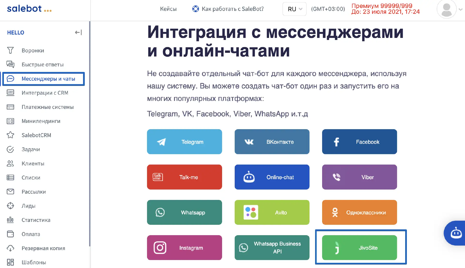 После регистрации вы будете перенаправлены в интерфейс SaleBot, где для подключения интеграции нужно перейти в раздел "Мессенджеры и чаты" и выбрать "JivoSite".