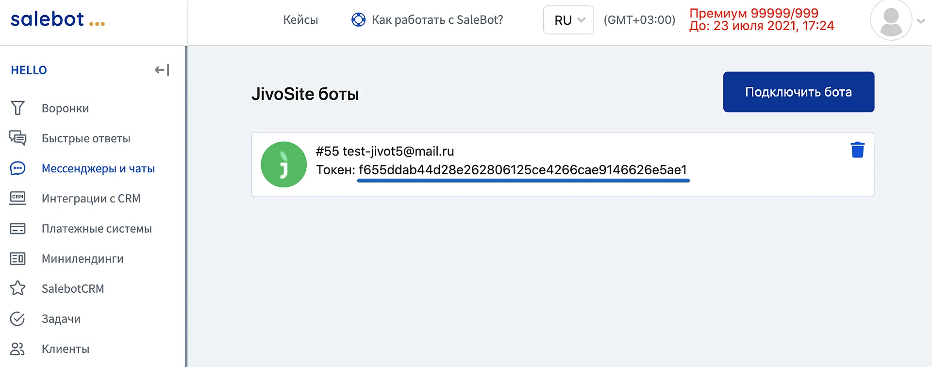 После этого в разделе "Мессенджеры и чаты" появится интеграция с Jivo с указанием токена.