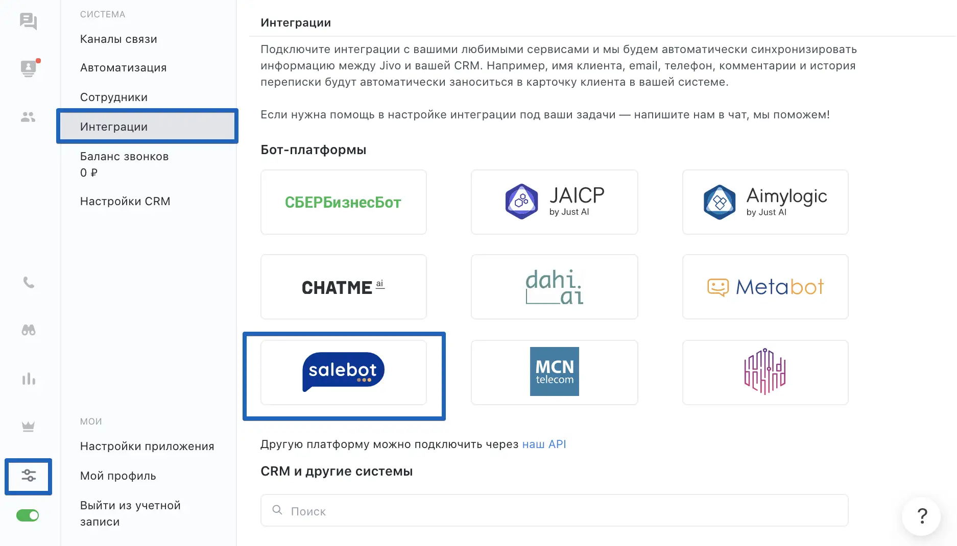Скопируйте токен, после чего откройте приложение Jivo и перейдите в «Управление» > «Интеграции» > «SaleBot».
