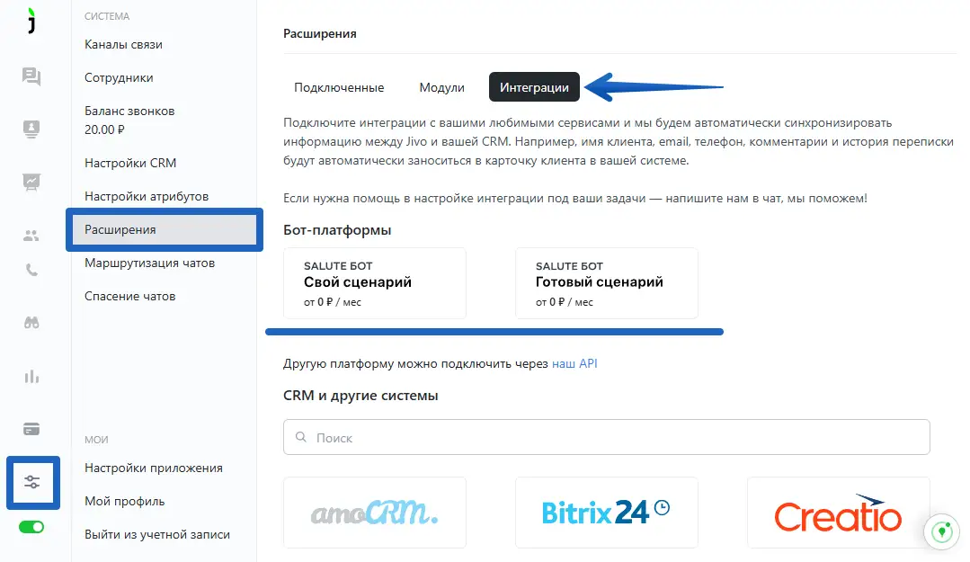 Чтобы подключить чат-бота SaluteBot, в приложении Jivo перейдите в "Управление" > "Расширения" > "Интеграции" и выберите "SaluteBot".