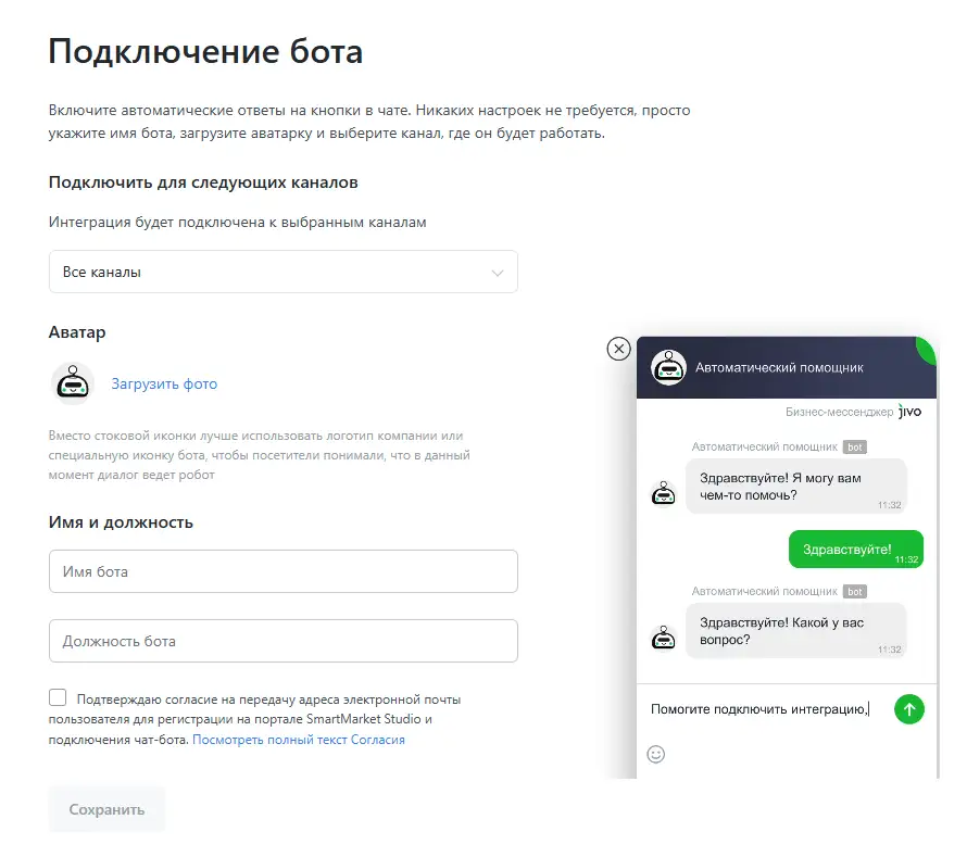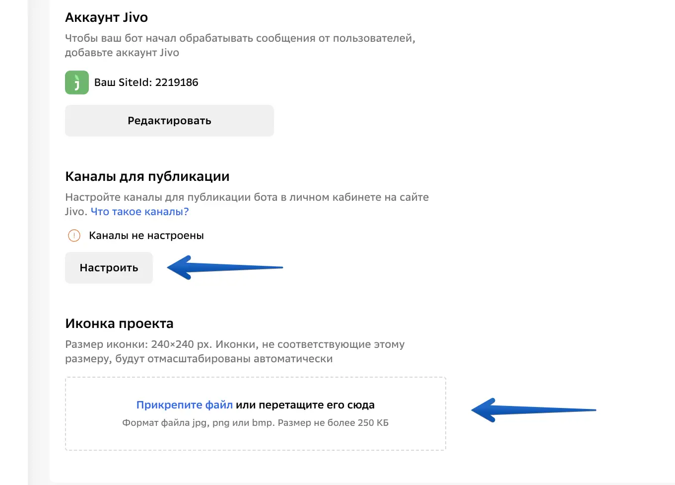 - Выбрать, в каких каналах бот будет отвечать (по умолчанию выбраны все каналы в вашем аккаунте Jivo).