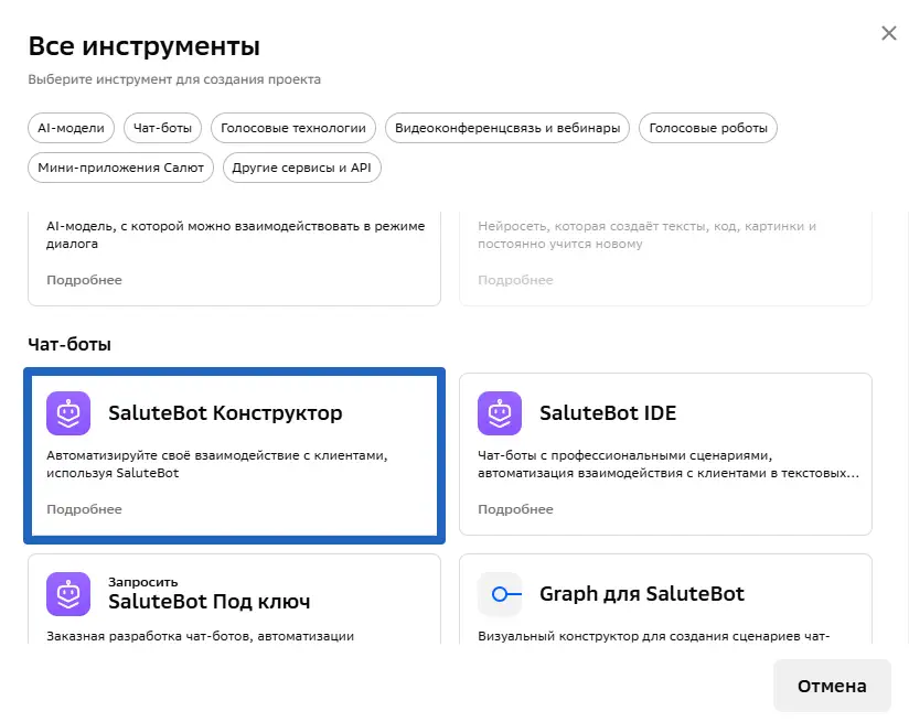 Вам откроется список доступных инструментов. Выберите "SaluteBot Конструктор".
