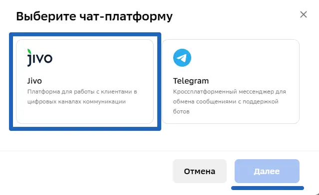 Чтобы подключить аккаунт Jivo, нажмите "Выбрать" в разделе "Выберите чат-платформу".