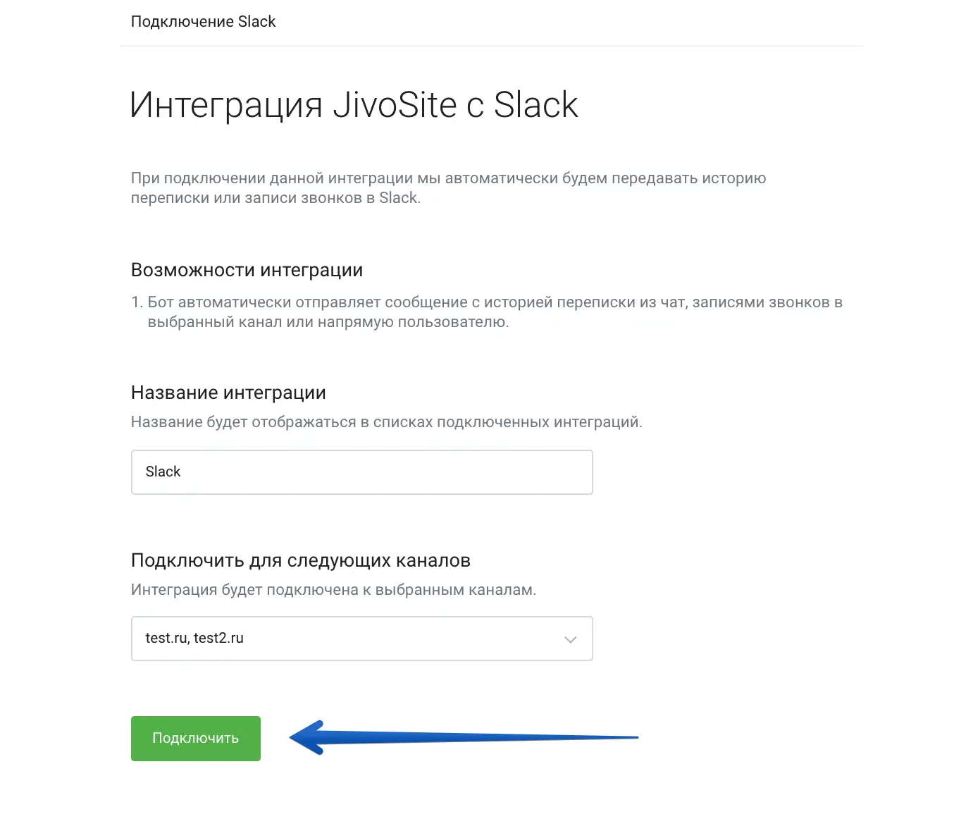 2. Подключить для следующих каналов. Кликните и отметьте каналы, для которых хотите включить интеграцию.